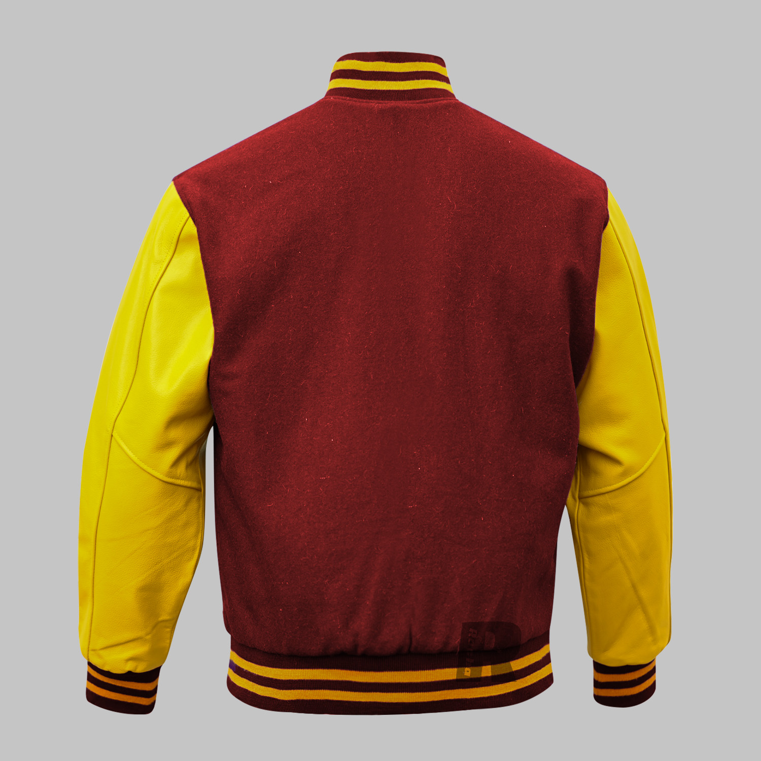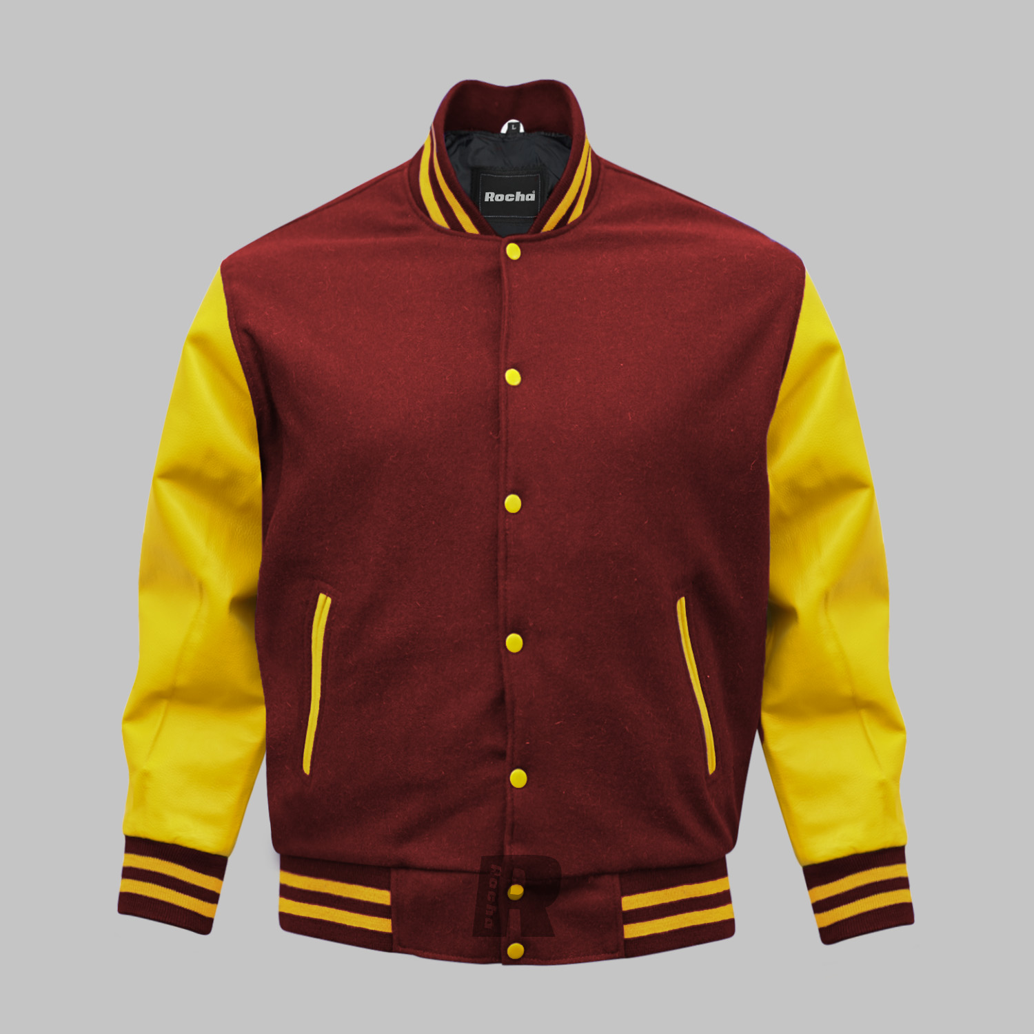 Baseball jackets design made of Superior quality of Wool 24-oz body in Burgundy and Genuine Cowhide Leather full Grain in White. This Custom Varsity Jacket with high quality 100% acrylic ribbing base color Burgundy and double stripe Yellow on collar, waist and cuffs.