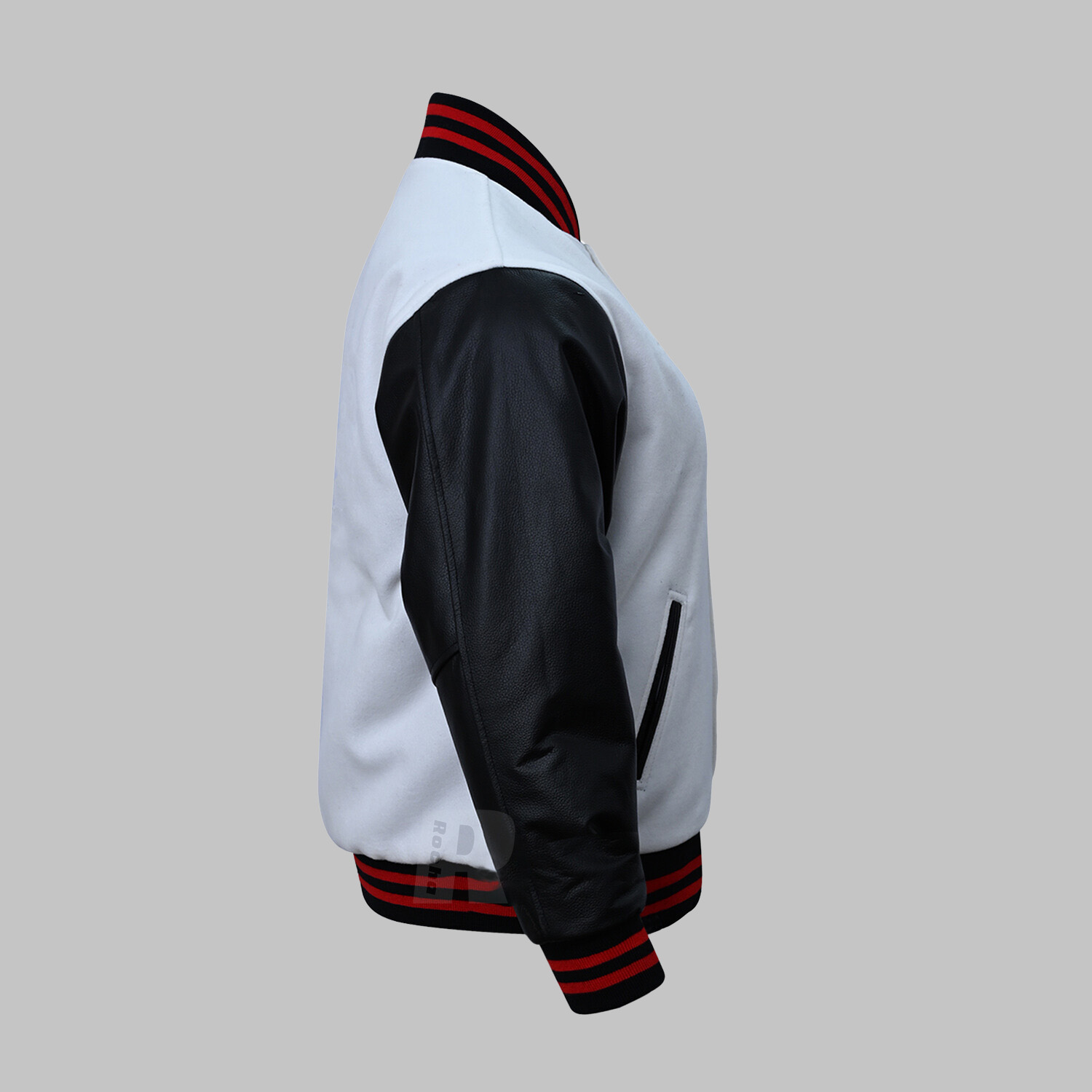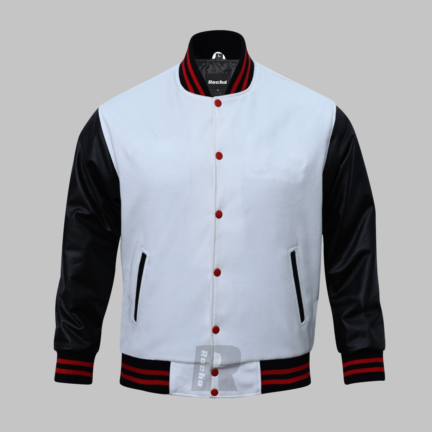 Best Quality Varsity Jackets made of Superior quality of Wool 24-oz body in White and Genuine Cowhide Leather full Grain in Black. This Custom Varsity Jacket with high quality 100% acrylic ribbing base color Black and double stripe Red on collar, waist and cuffs.