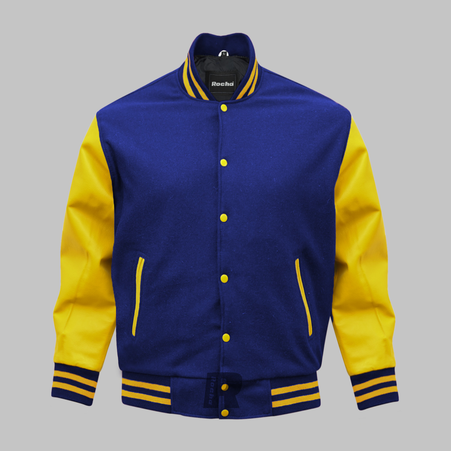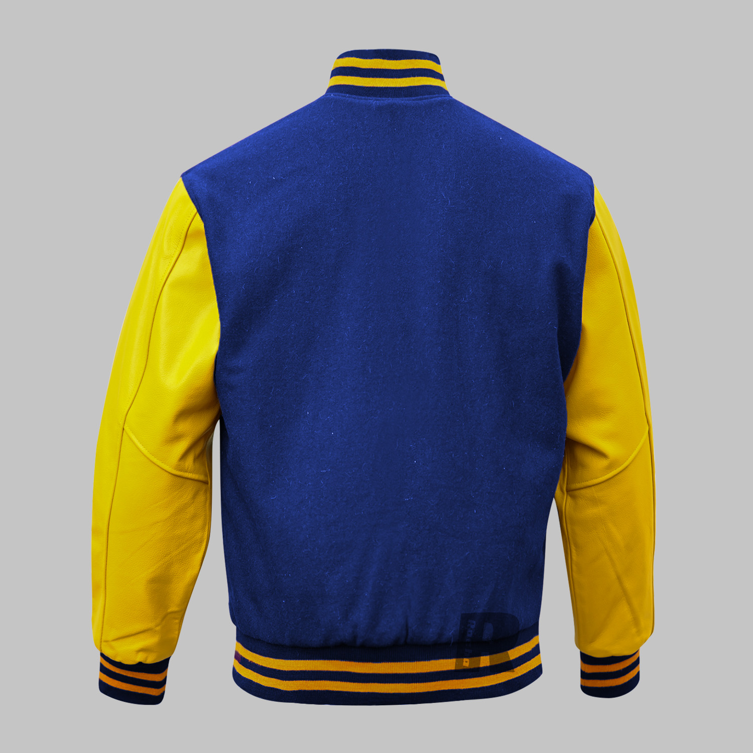 Build your own letterman jacket made of Superior quality of Wool 24-oz body in Navy Blue and Genuine Cowhide Leather full Grain in Yellow. This Custom Varsity Jacket with high quality 100% acrylic ribbing base color Navy  Blue and double stripe Yellow on collar, waist and cuffs.