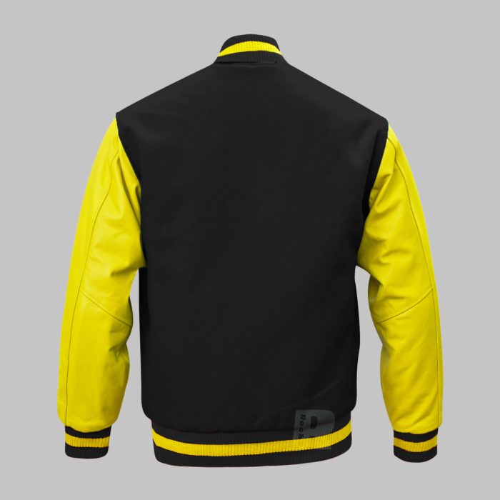 Class Baseball jackets made of Superior quality of Wool 24-oz body in Black and Genuine Cowhide Leather full Grain in Yellow. This Custom Varsity Jacket with high quality 100% acrylic ribbing base color Black and single stripe Yellow on collar, waist and cuffs.