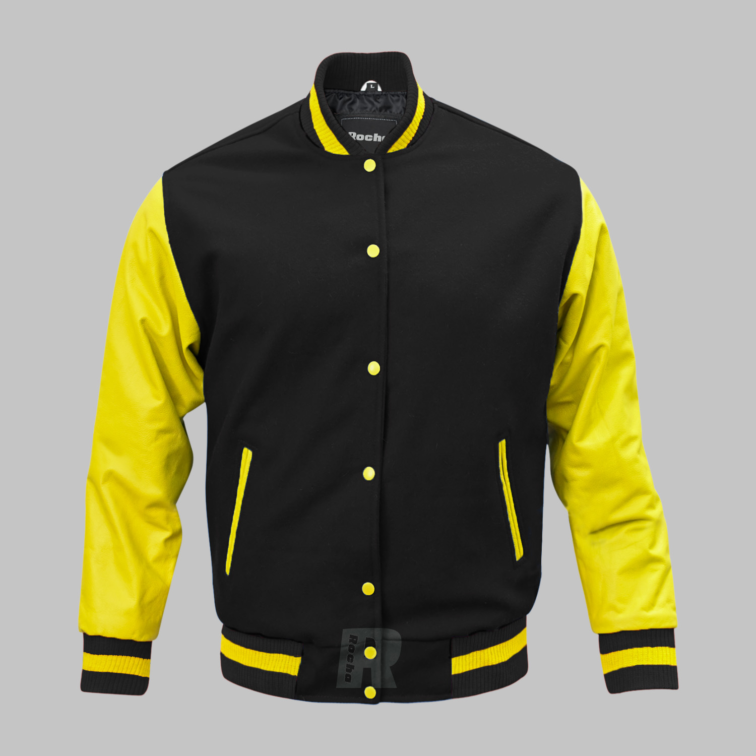 This Jacket closure with high quality varsity snaps / button front closure in Yellow, inside quilted diamond laser lining black to warm jacket.
