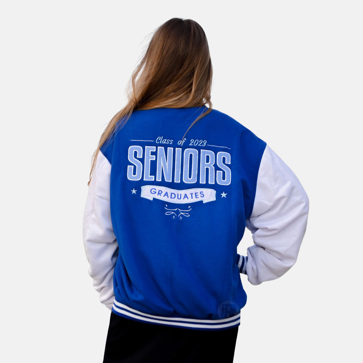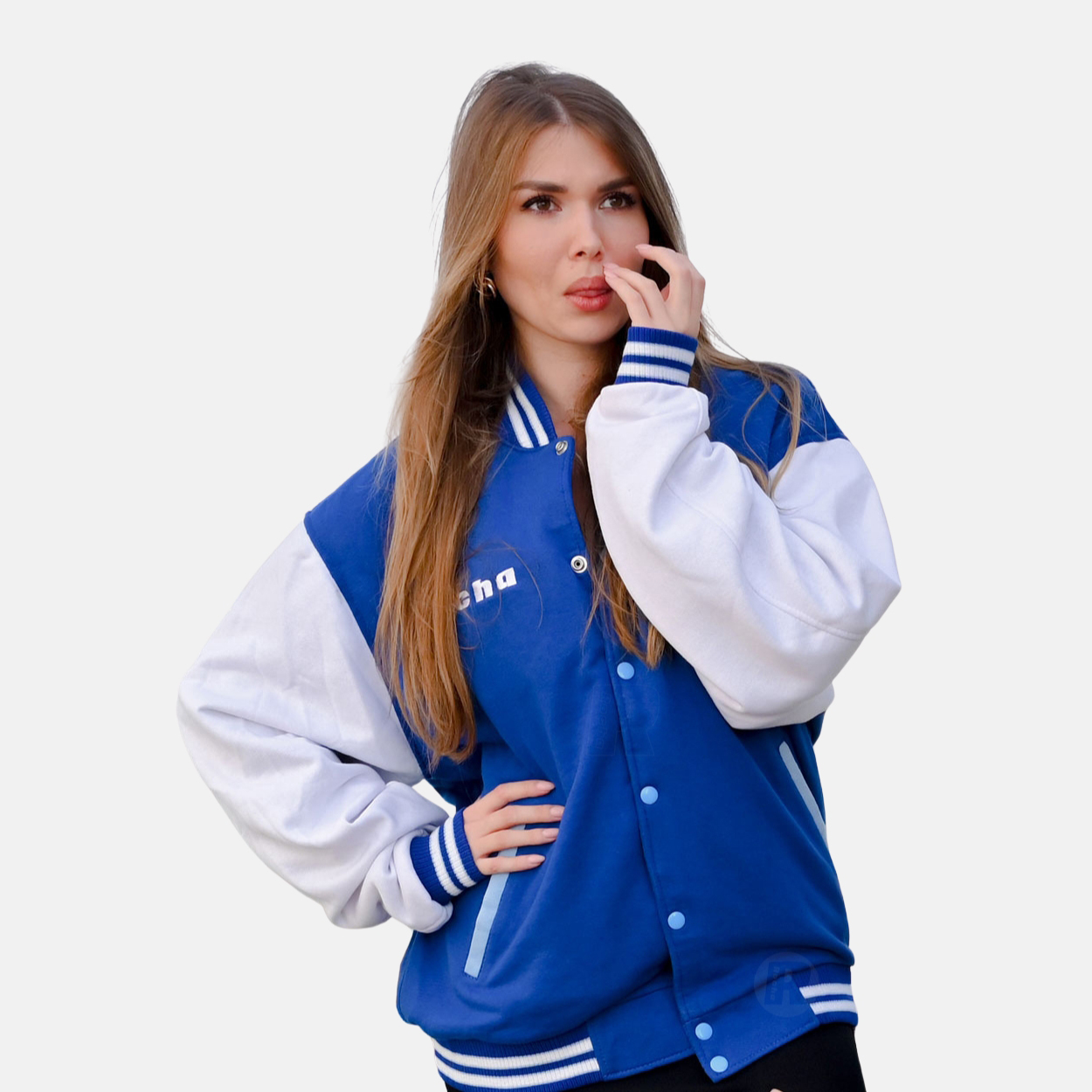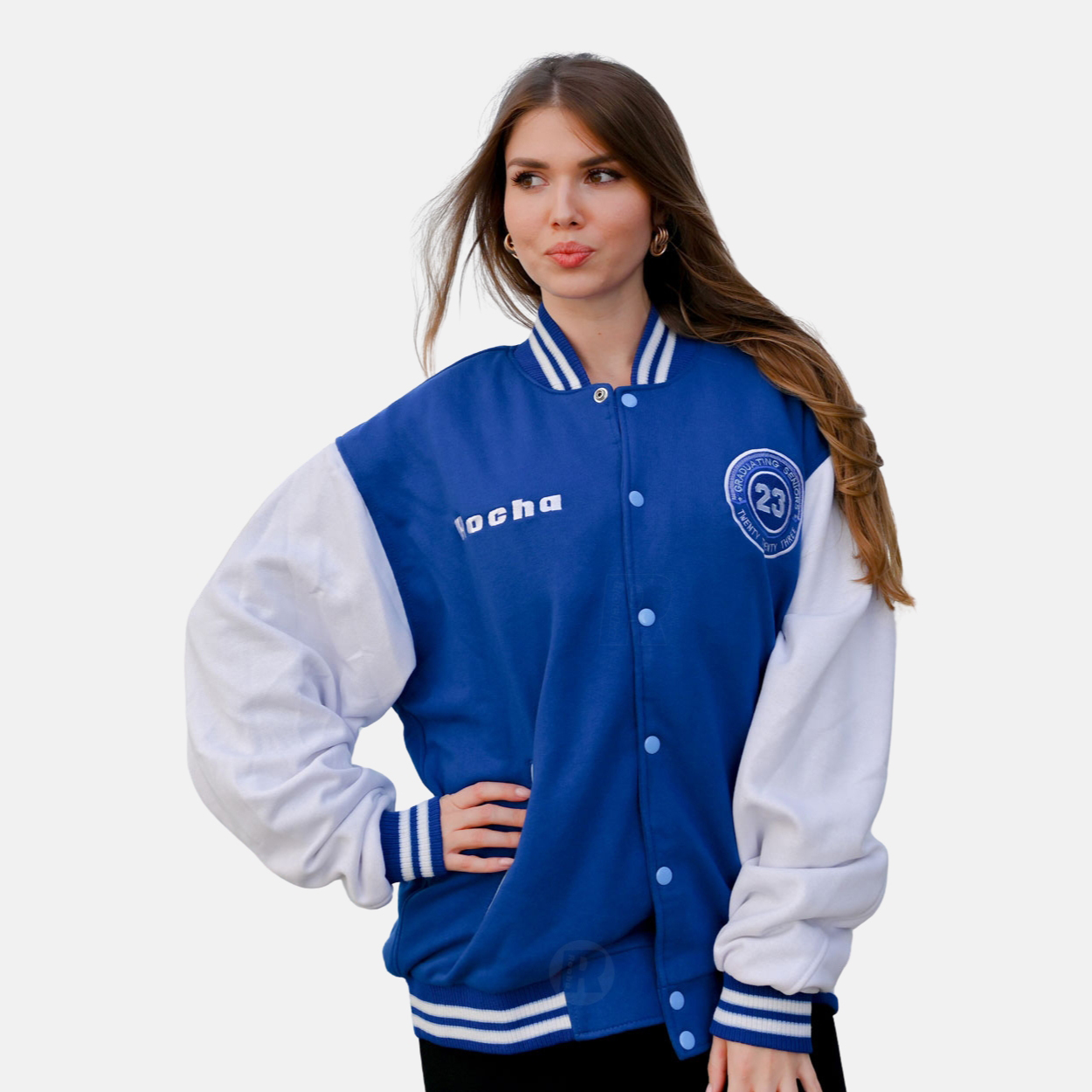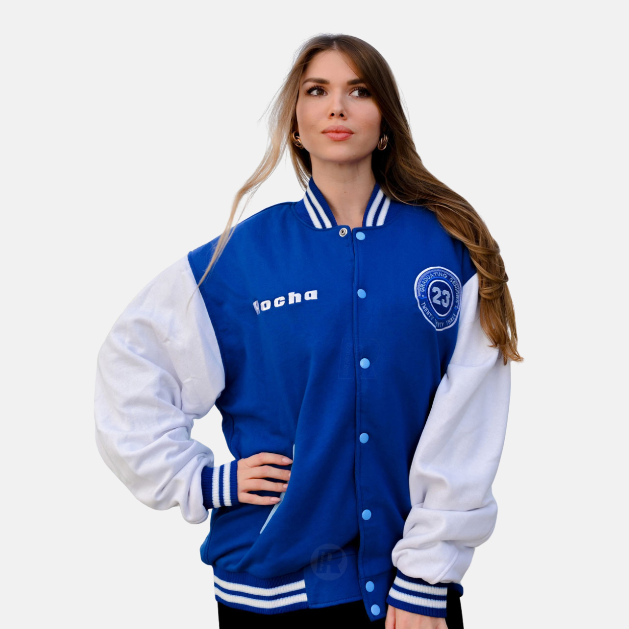 Collage Varsity Jackets are produced with a premium cotton fleece Royal Blue body and White sleeves. We used 100% acrylic ribbing on the collar, cuffs, and waistband. 7 polish-coated varsity snaps are used for front closure, two slash pockets, and one inside pocket as per sleeve materials.