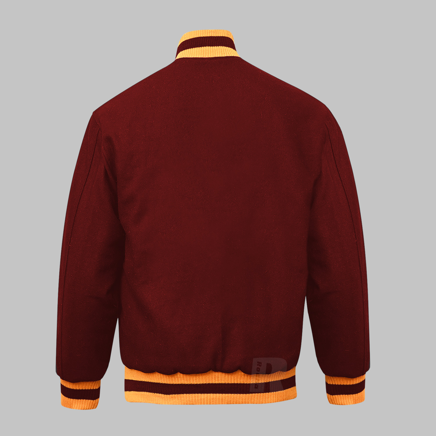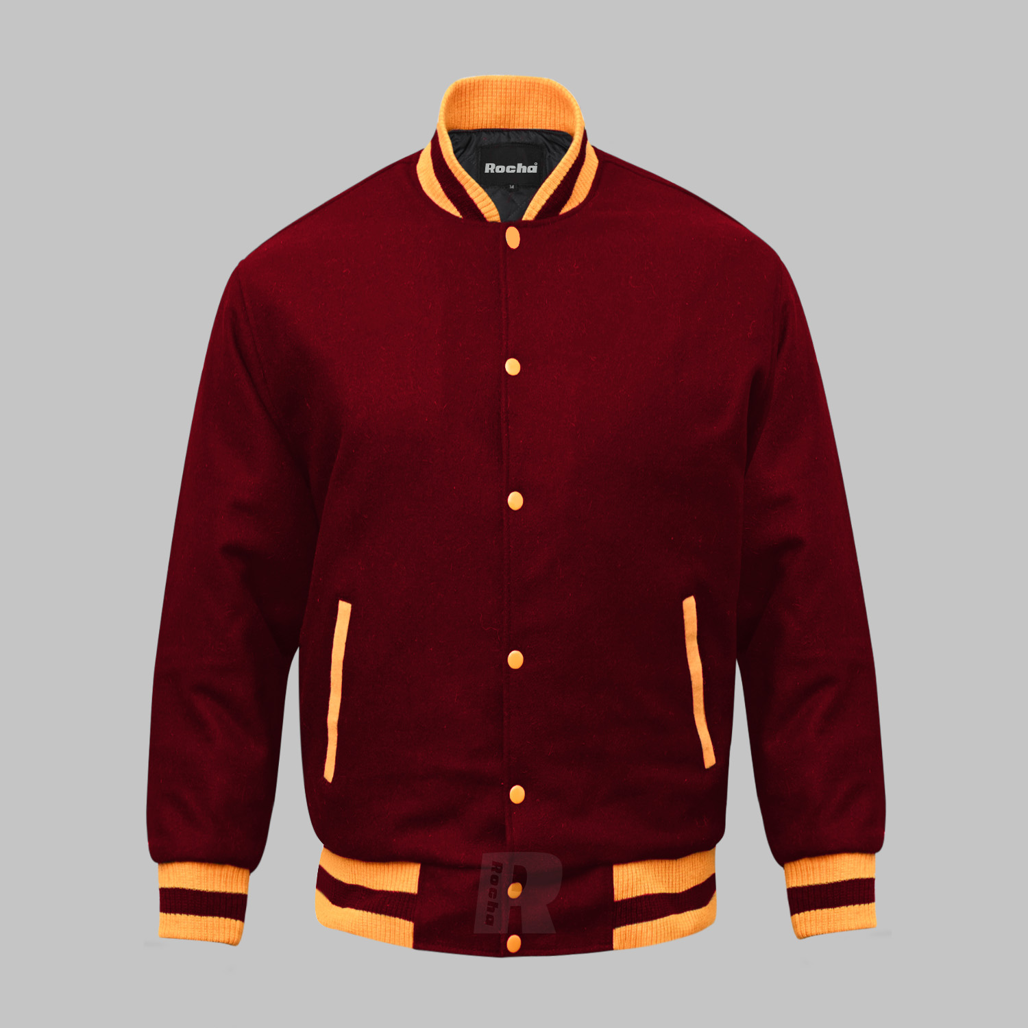 College jackets made of Superior quality of Wool 24-oz body and Sleeves in Maroon. This Custom Varsity Jacket with high quality 100% acrylic ribbing base color Maroon and single stripe Yellow on collar, waist and cuffs.