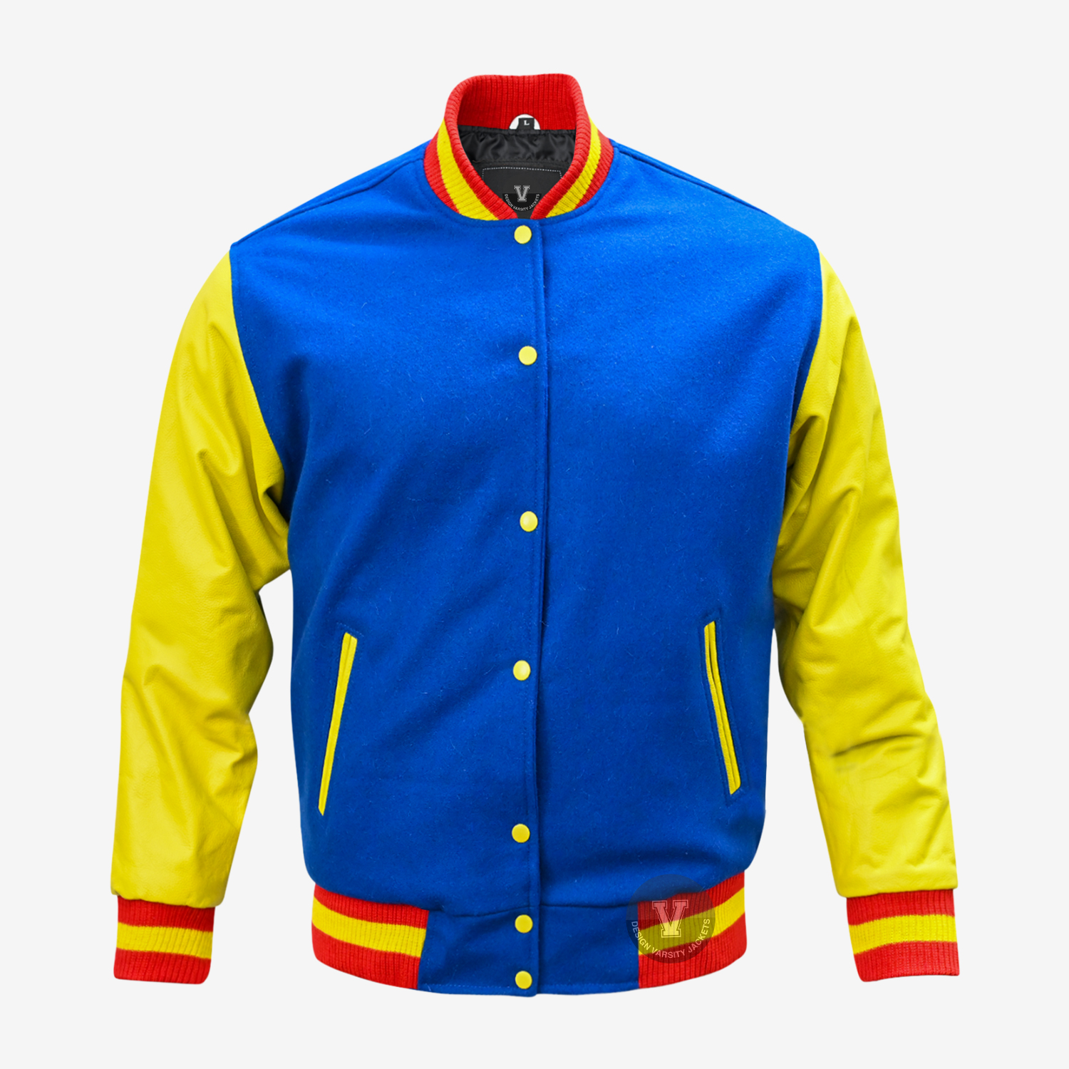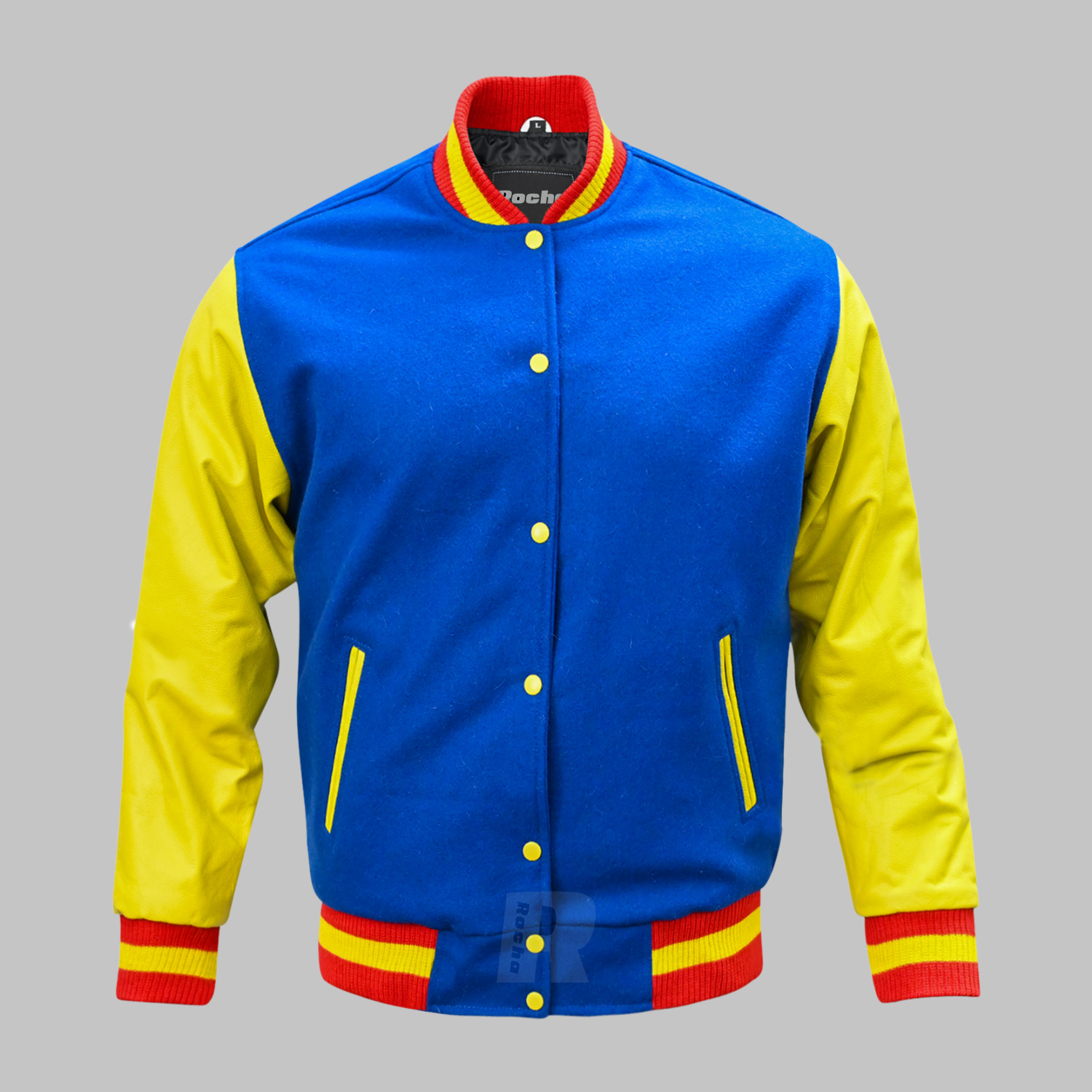 Custom Letterman Jackets Royal Yellow made of Superior quality of Melton Wool 24-oz body in Royal Blue and Genuine Cowhide Leather full Grain in Yellow. This Custom Varsity Jacket with high quality 100% acrylic ribbing base color Red and single stripe Yellow on collar, waist and cuffs.