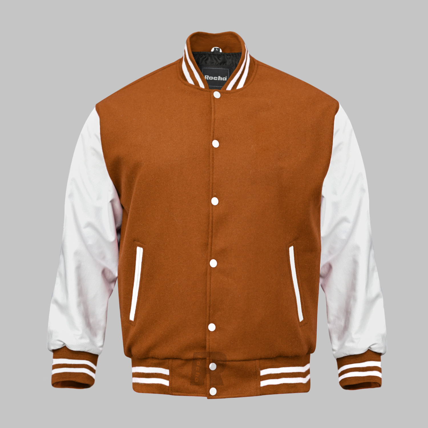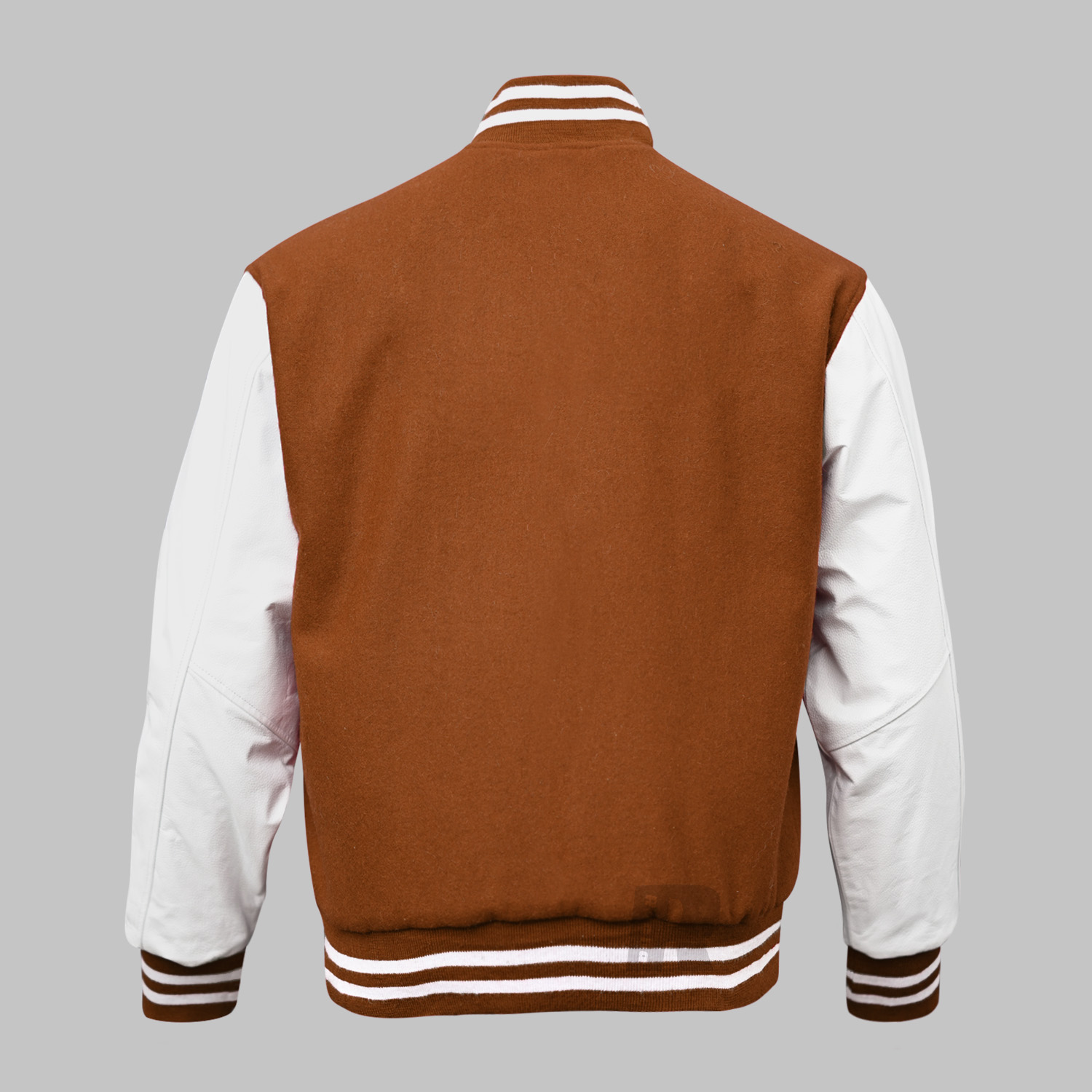 Custom made Letterman jacket made of Superior quality of Wool 24-oz body in Brown and Genuine Cowhide Leather full Grain in White. This Custom Varsity Jacket with high quality 100% acrylic ribbing base color Brown and double stripe White on collar, waist and cuffs.
