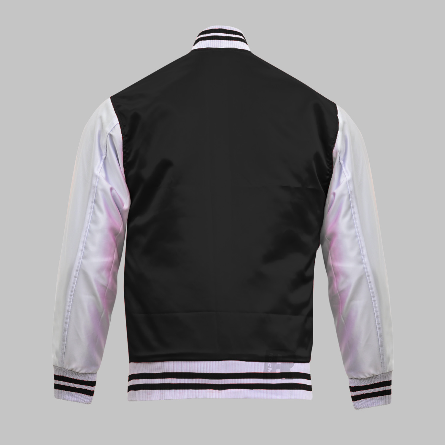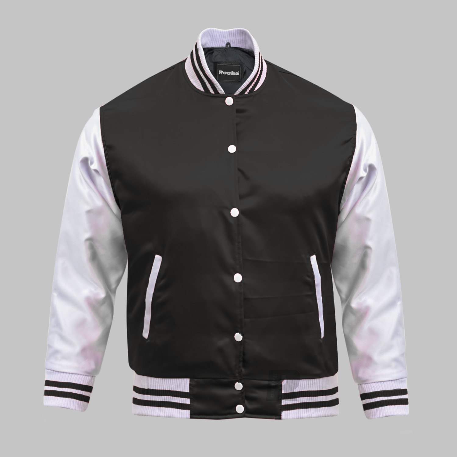 Custom varsity jackets canada made of Superior quality of Polyester Satin body in Black and Sleeves in White. This Custom Varsity Jacket with high quality 100% acrylic ribbing base color White and double stripe Black on collar, waist and cuffs.