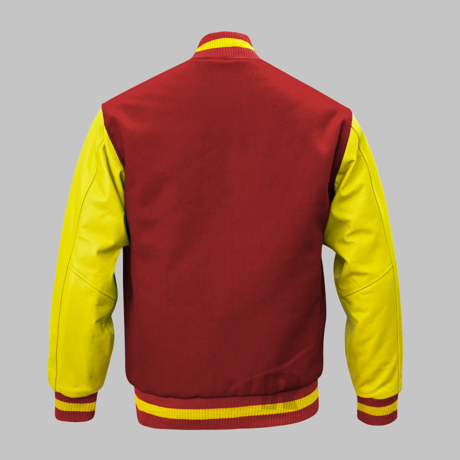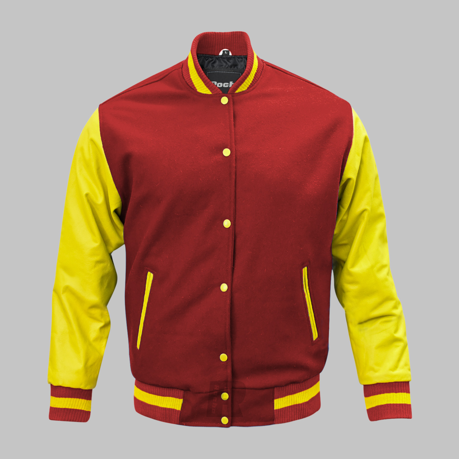 Design a varsity jacket made of Superior quality of Wool 24-oz body in Maroon and Genuine Cowhide Leather full Grain in Yellow. This Custom Varsity Jacket with high quality 100% acrylic ribbing base color Maroon and single stripe Yellow on collar, waist and cuffs.