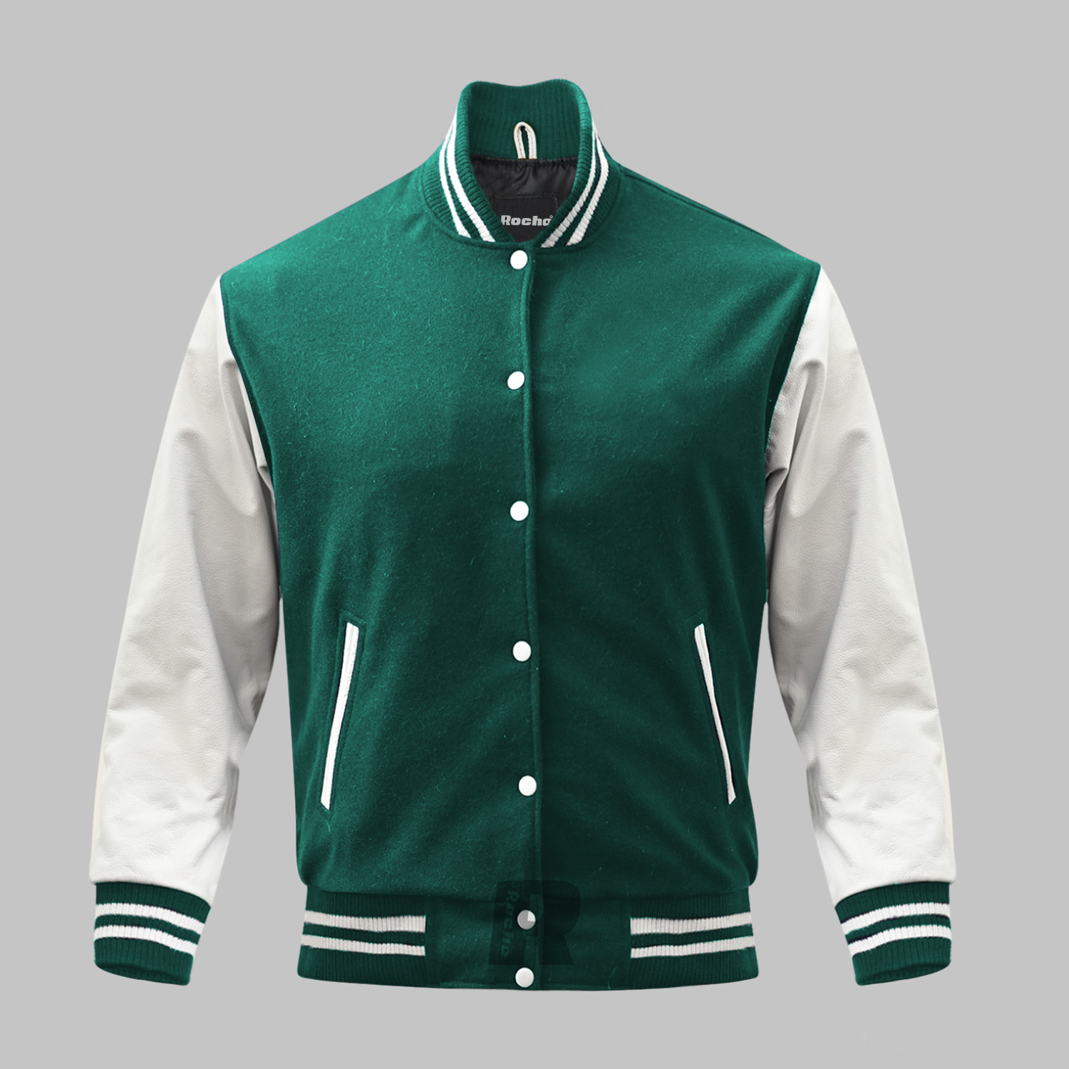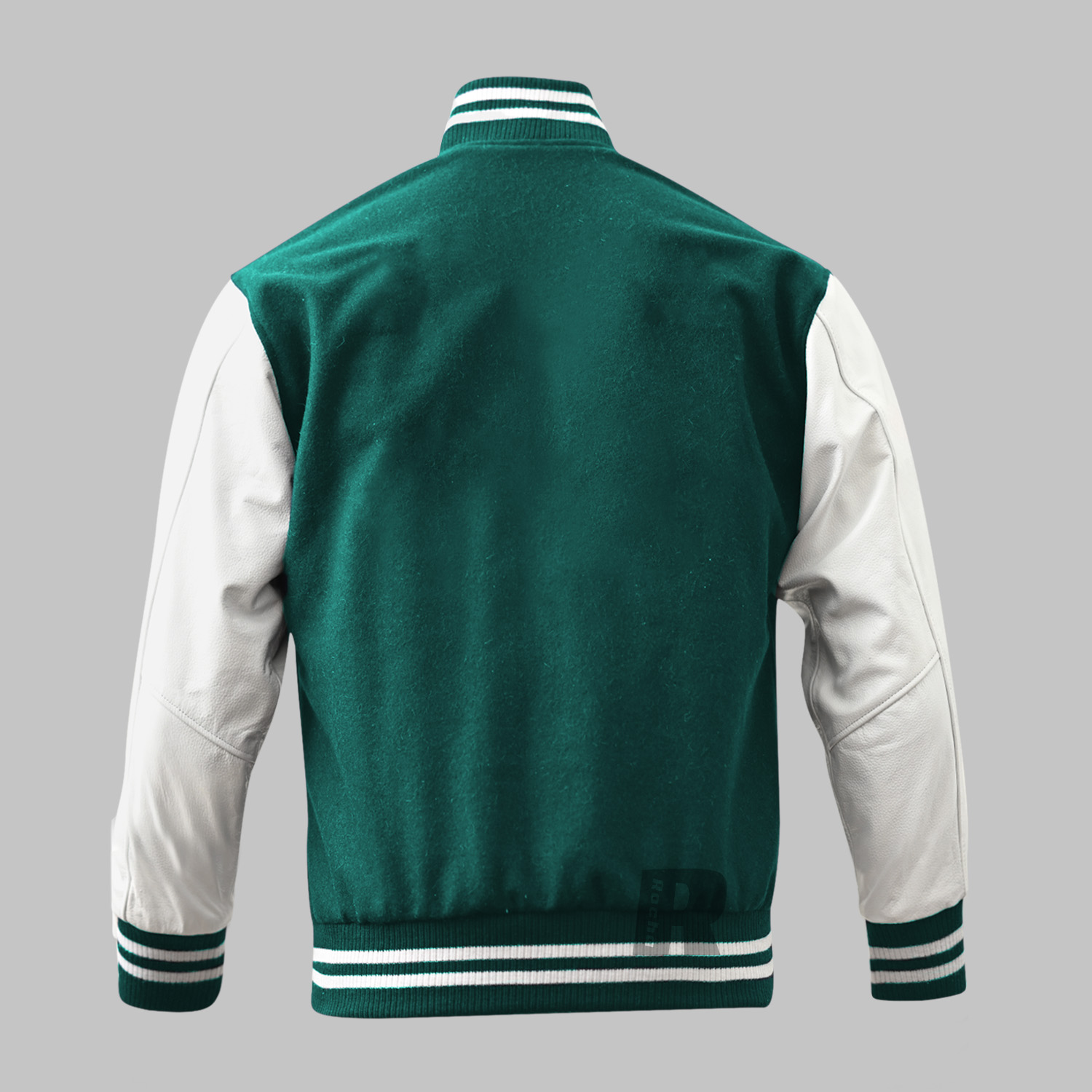 Design senior jacket made of Superior quality of Wool 24-oz body in Green and Genuine Cowhide Leather full Grain in White. This Custom Varsity Jacket with high quality 100% acrylic ribbing base color Green and double stripe White on collar, waist and cuffs.
