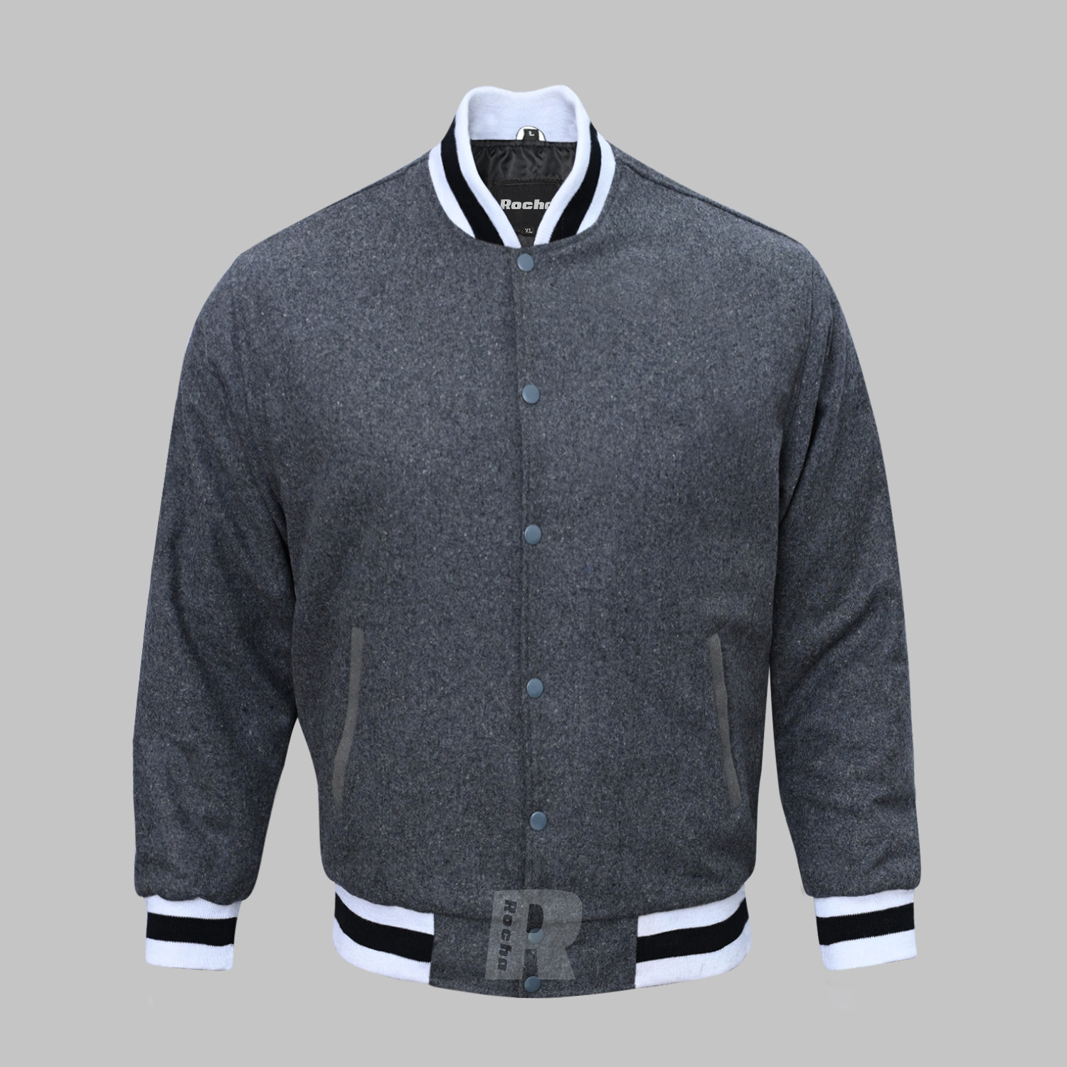 This Jacket closure with high quality varsity snaps / button front closure in Grey, inside quilted diamond laser lining black to warm jacket.