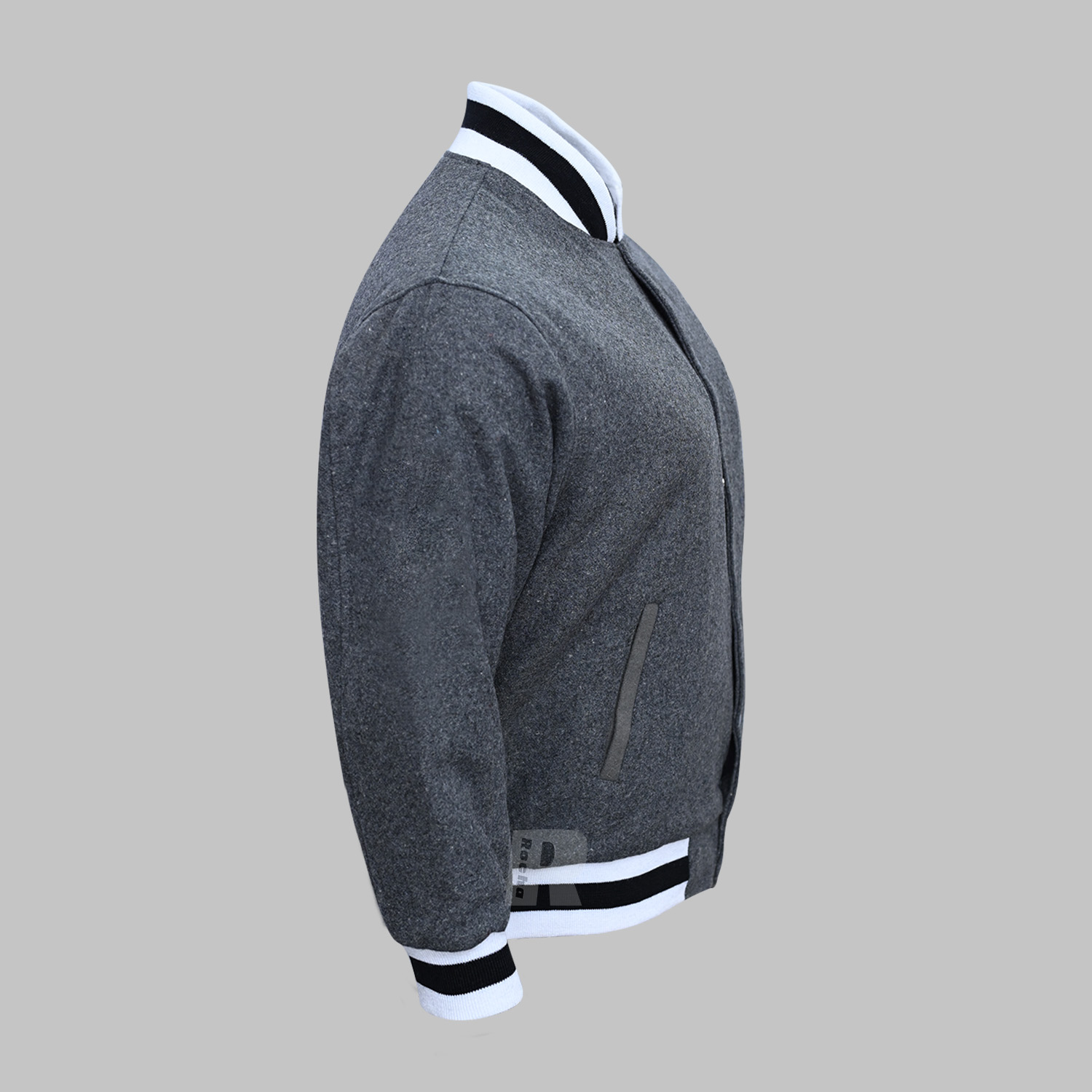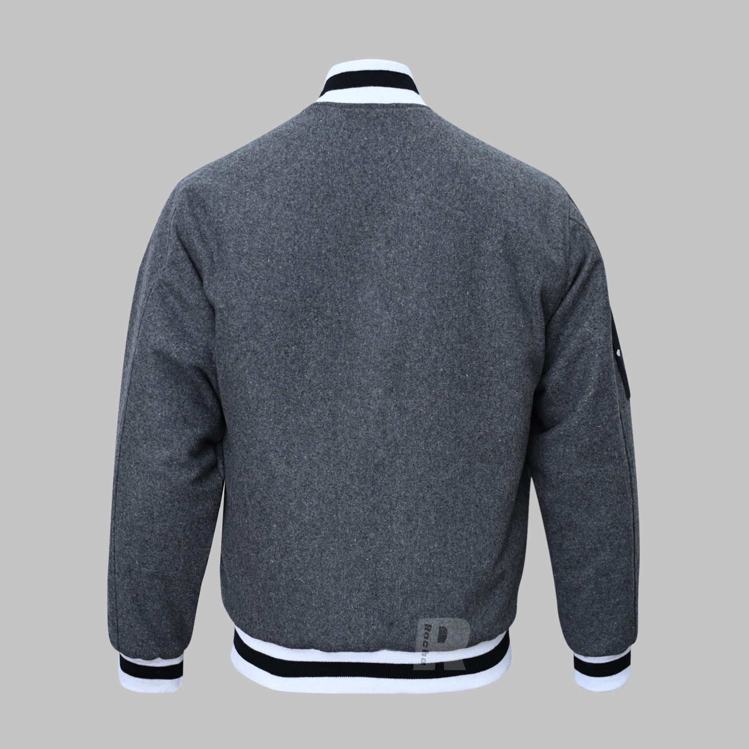 High school letterman jacket made of Superior quality of Wool 24-oz body in Charcoal Grey body and Sleeves. This Custom Varsity Jacket with high quality 100% acrylic ribbing base color White and single stripe Black on collar, waist and cuffs.