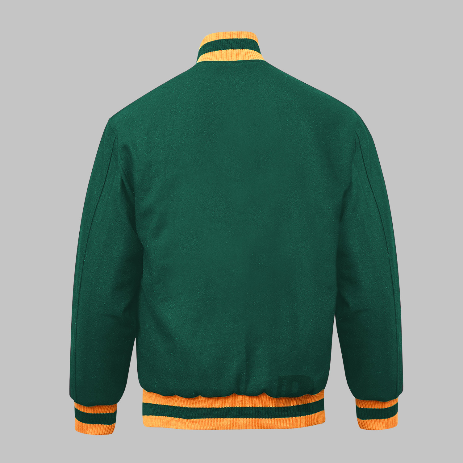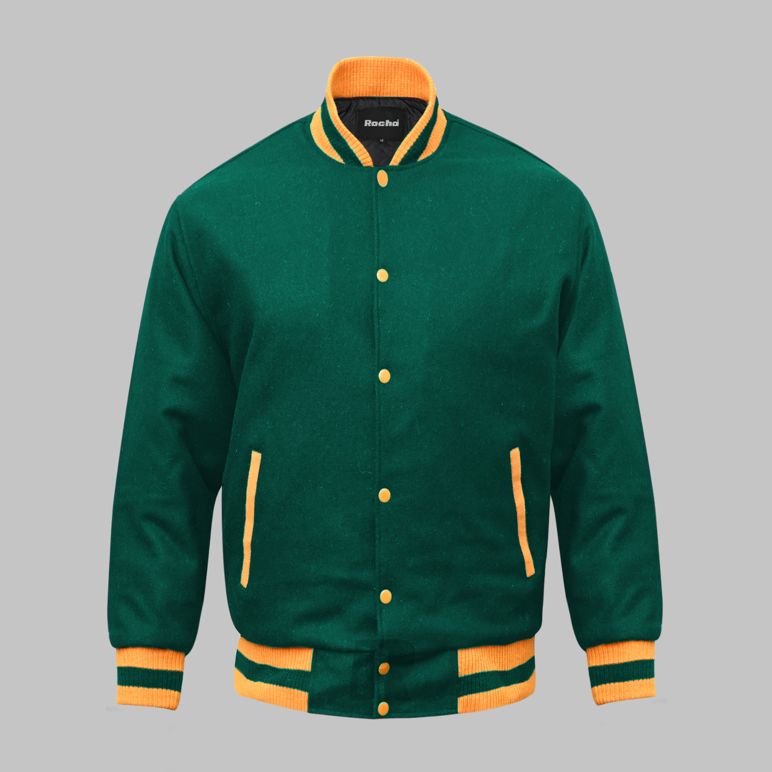 Letterman Jacket Vintage made of Superior quality of Wool 24-oz body and Sleeves in Green. This Custom Varsity Jacket with high quality 100% acrylic ribbing base color Yellow and double stripe Green on collar, waist and cuffs.