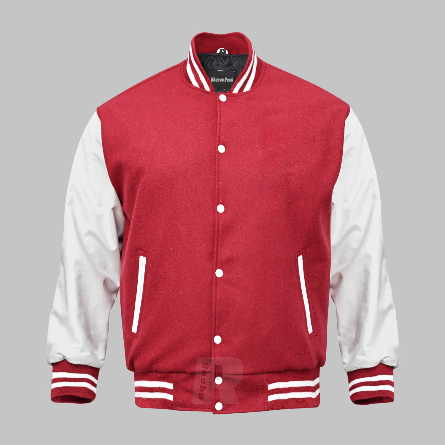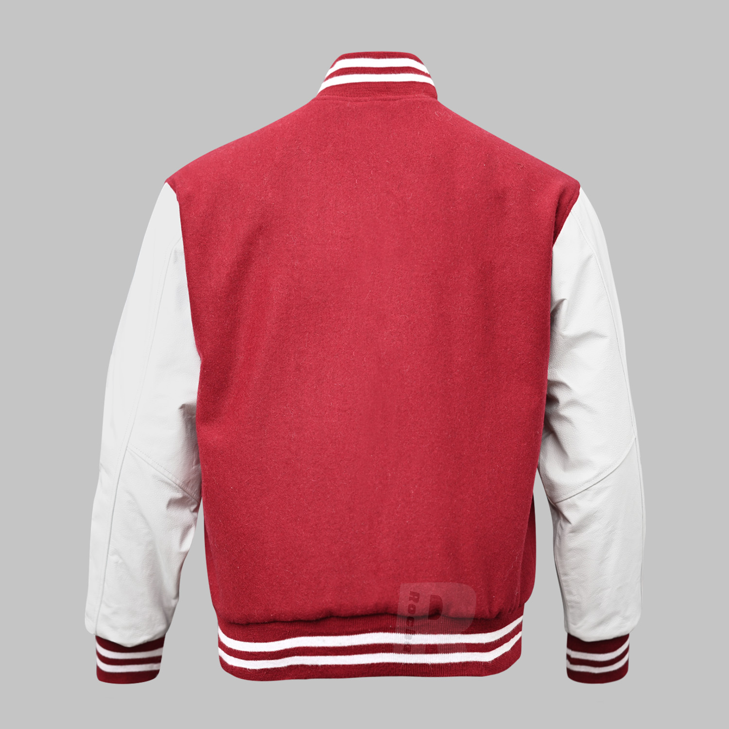 Letterman Jackets Women made of Superior quality of Wool 24-oz body in Red and Genuine Cowhide Leather full Grain in White. This Custom Varsity Jacket with high quality 100% acrylic ribbing base color Red and double stripe White on collar, waist and cuffs.