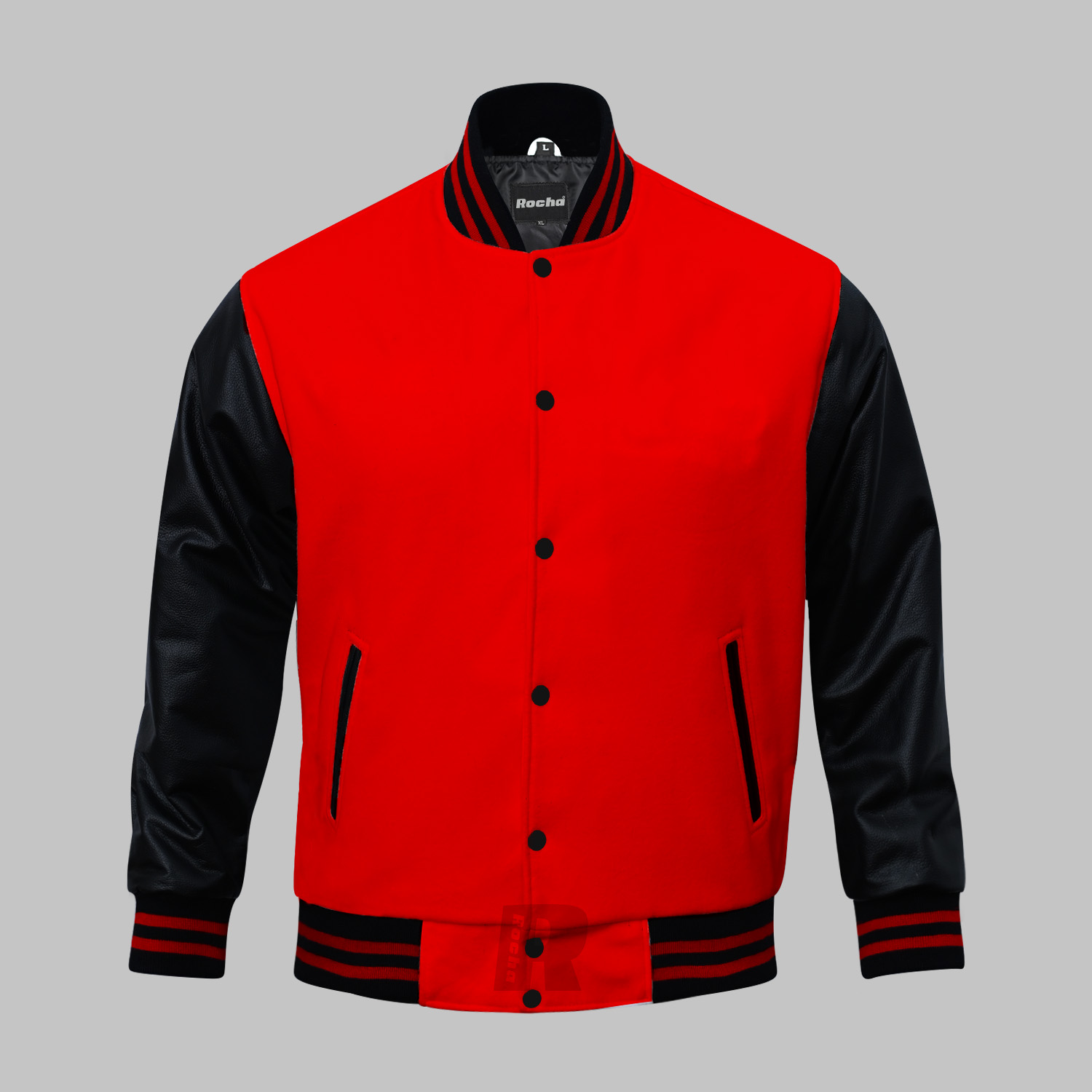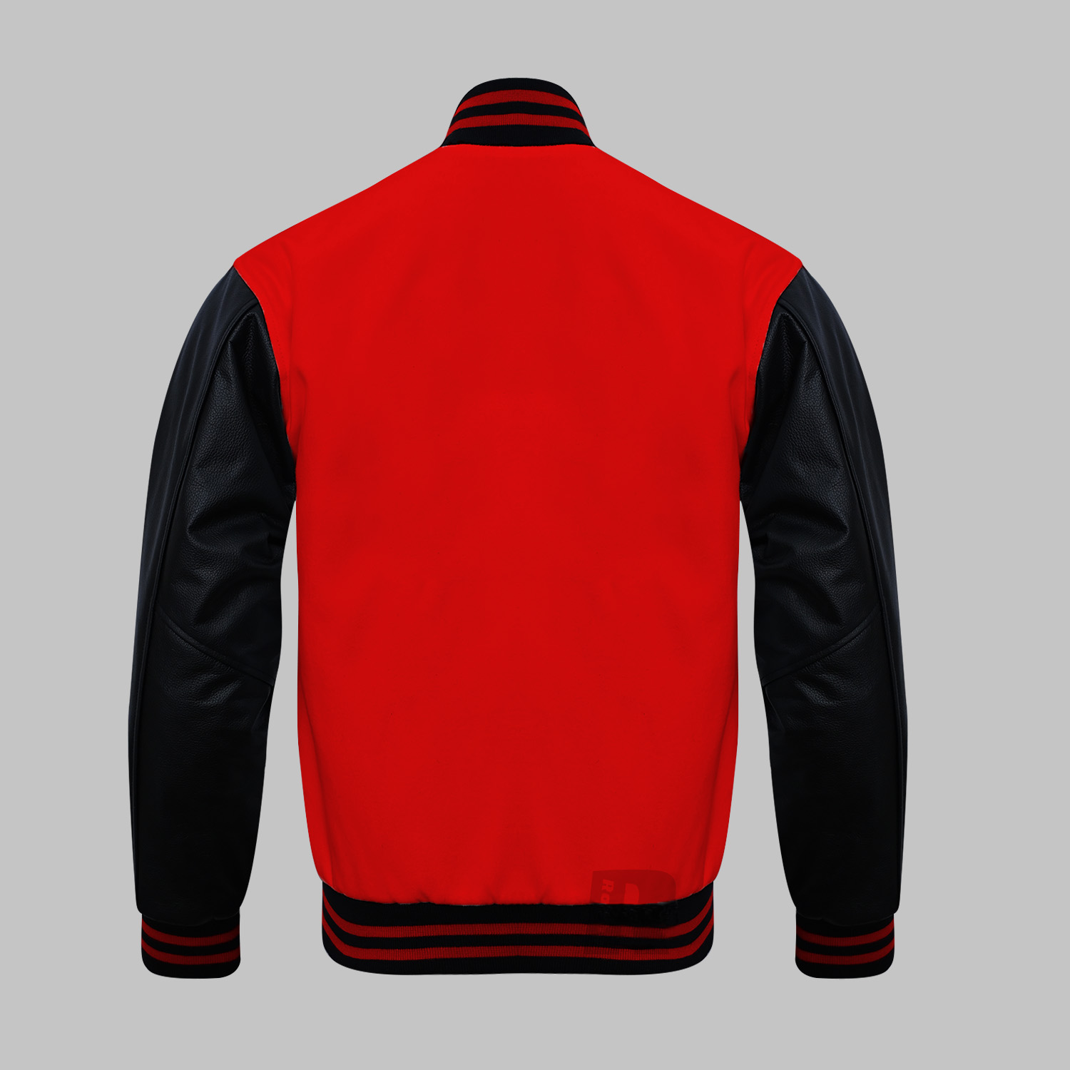 Personalized College Jackets made of Superior quality of Wool 24-oz body in Red and Genuine Cowhide Leather full Grain in Black. This Custom Varsity Jacket with high quality 100% acrylic ribbing base color Black and double stripe Red on collar, waist and cuffs.