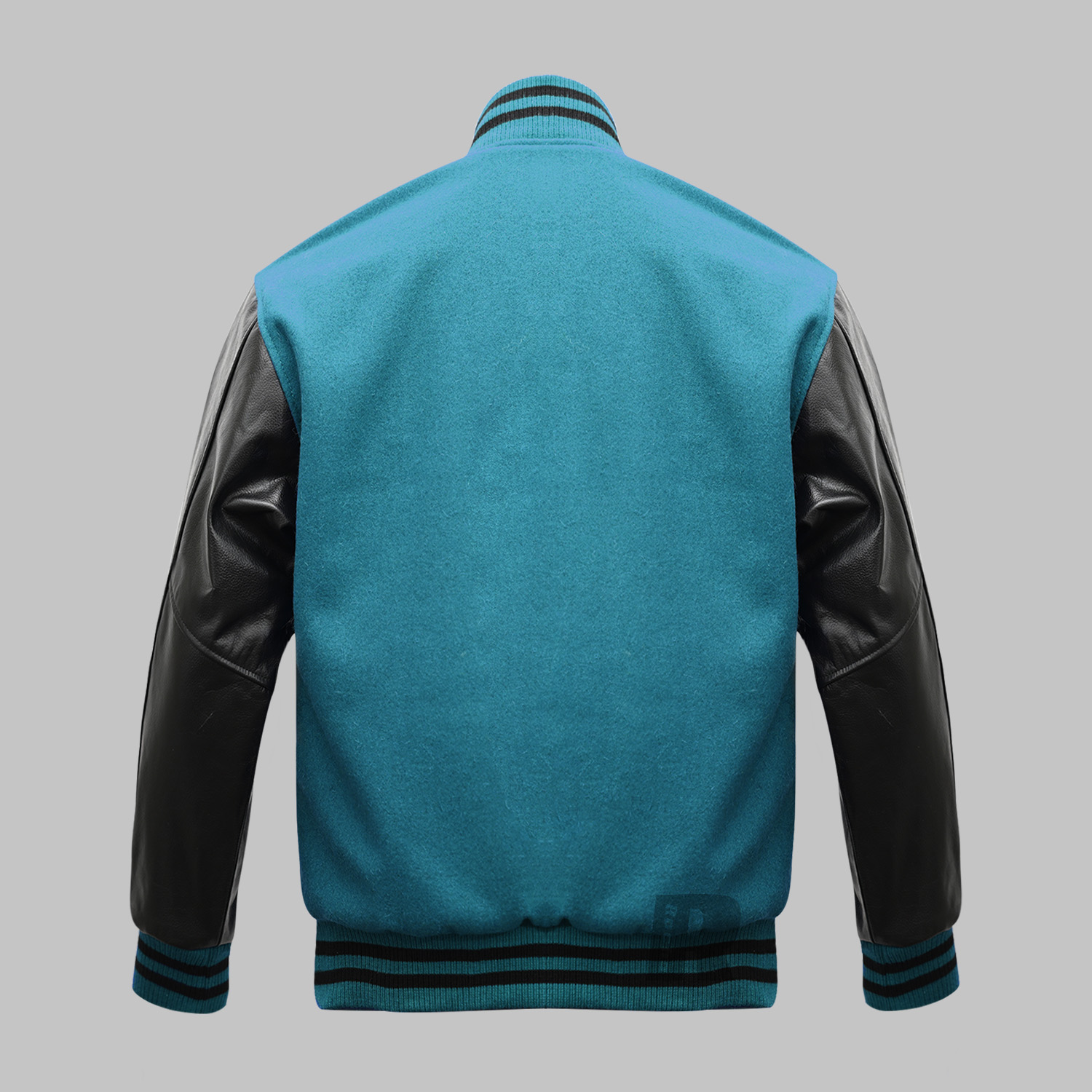Personalized varsity jacket made of Superior quality of Wool 24-oz body in Columbia Blue and Genuine Cowhide Leather full Grain in Black. This Custom Varsity Jacket with high quality 100% acrylic ribbing base color Columbia Blue and double stripe Black on collar, waist and cuffs.