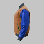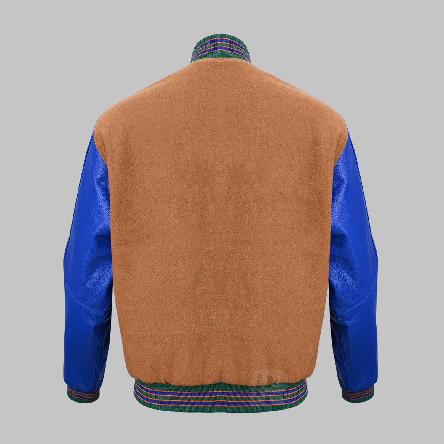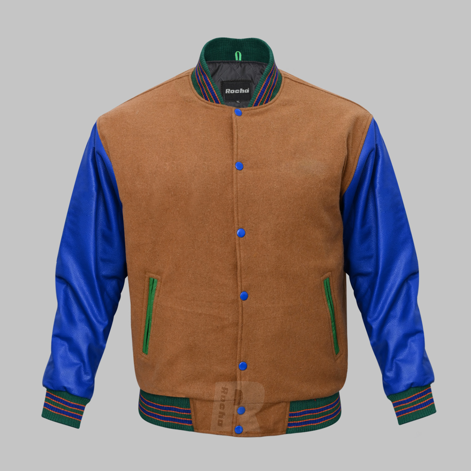 Quality Varsity Jackets made of Superior quality of Wool 24-oz body in Brown and Genuine Cowhide Leather full Grain in Royal Blue. This Custom Varsity Jacket with high quality 100% acrylic ribbing base color Green and double stripe Royal Blue on collar, waist and cuffs.