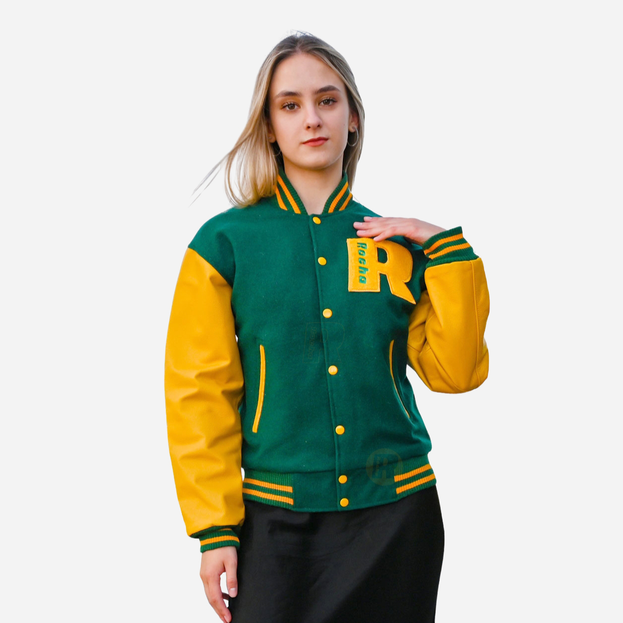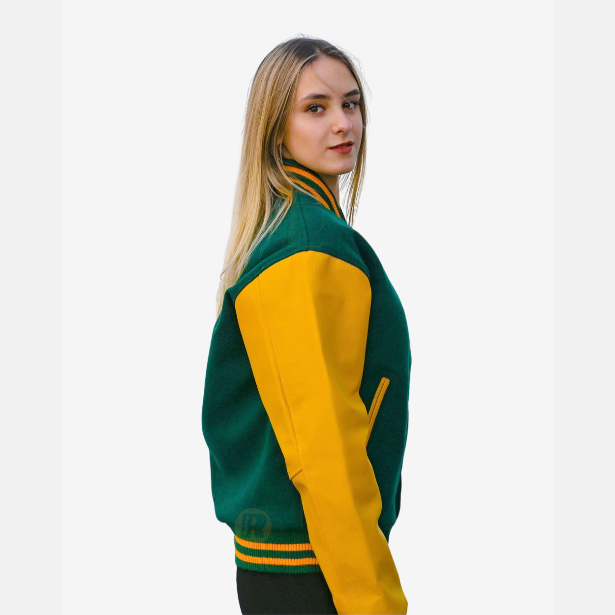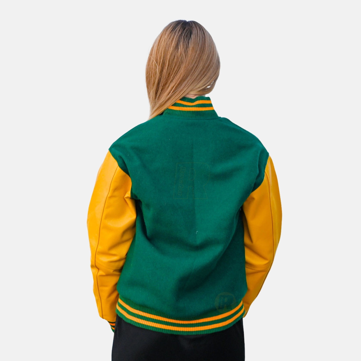 School Letterman Jackets made of Superior quality of Melton Wool 24-oz body in Forest Green and Genuine Cowhide Leather full Grain in Athletic Gold. This Custom Varsity Jacket with high quality 100% acrylic ribbing base color Forest Green and two stripes Athletic Gold on collar, waist and cuffs. This Jacket closure with high quality varsity snaps / button front closure in Athletic Gold, inside quilted diamond laser lining black to warm jacket.