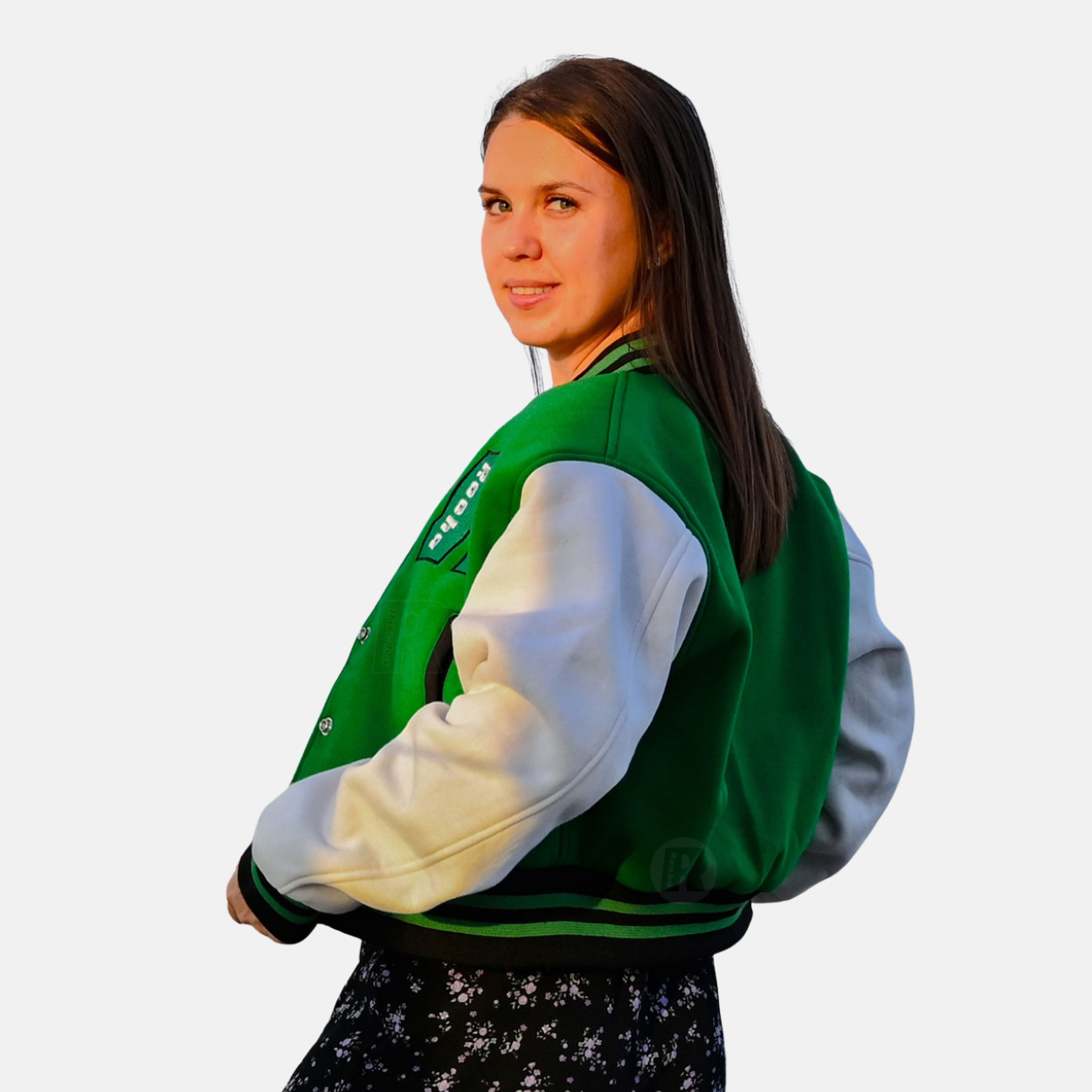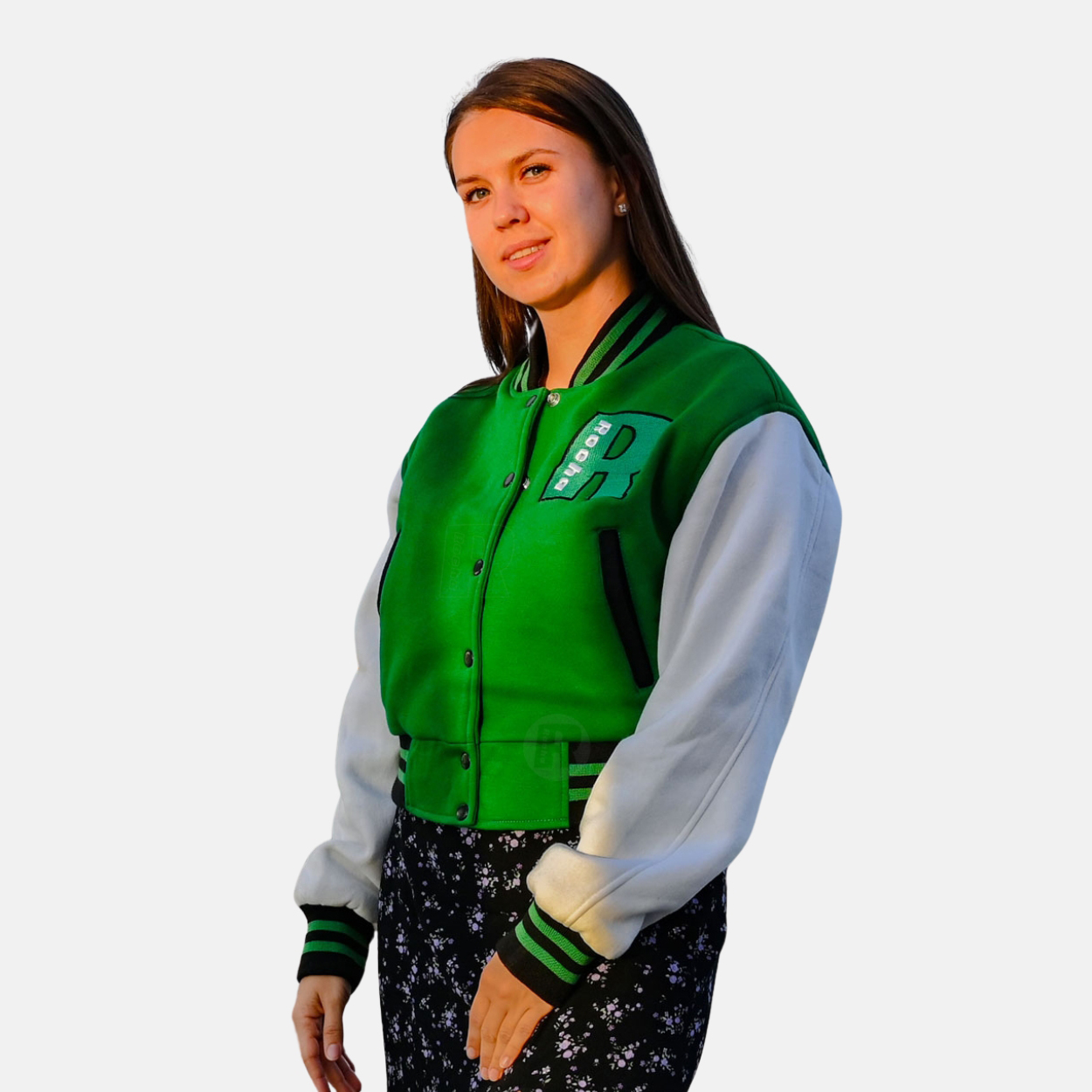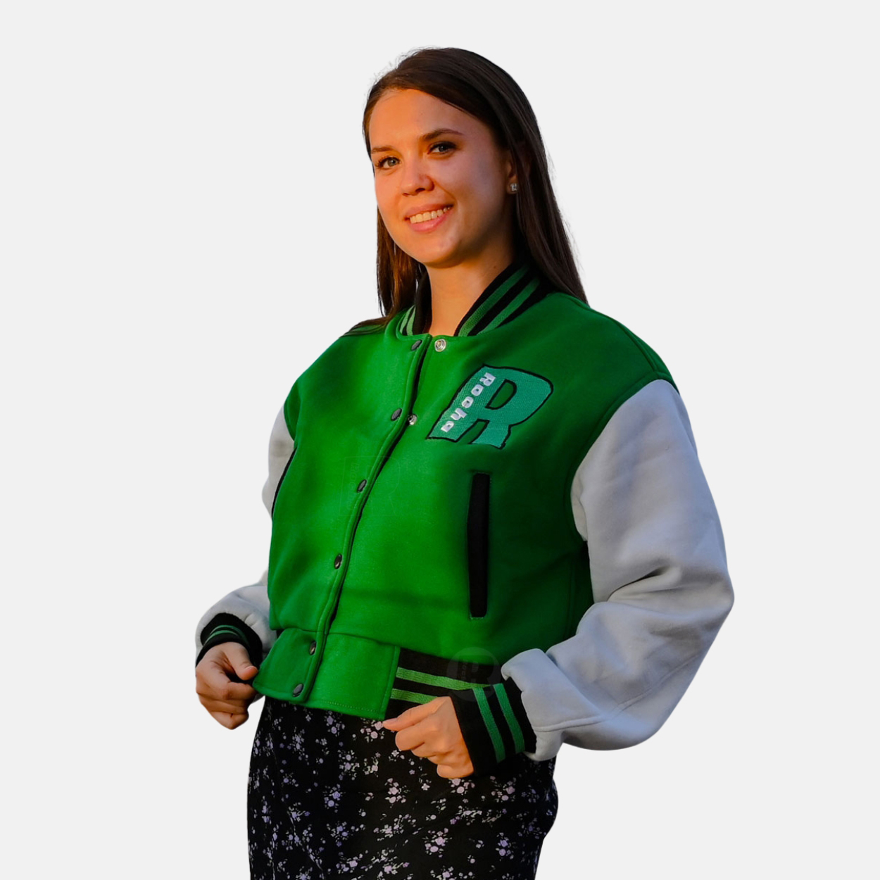 School Varsity Jackets Women are produced with a premium cotton fleece Green body and White sleeves. We used 100% acrylic ribbing on the collar, cuffs, and waistband. 7 polish-coated varsity snaps are used for front closure, two slash pockets, and one inside pocket as per sleeve materials.