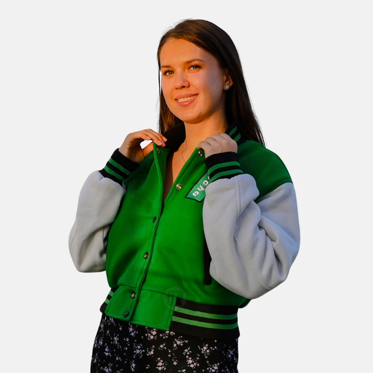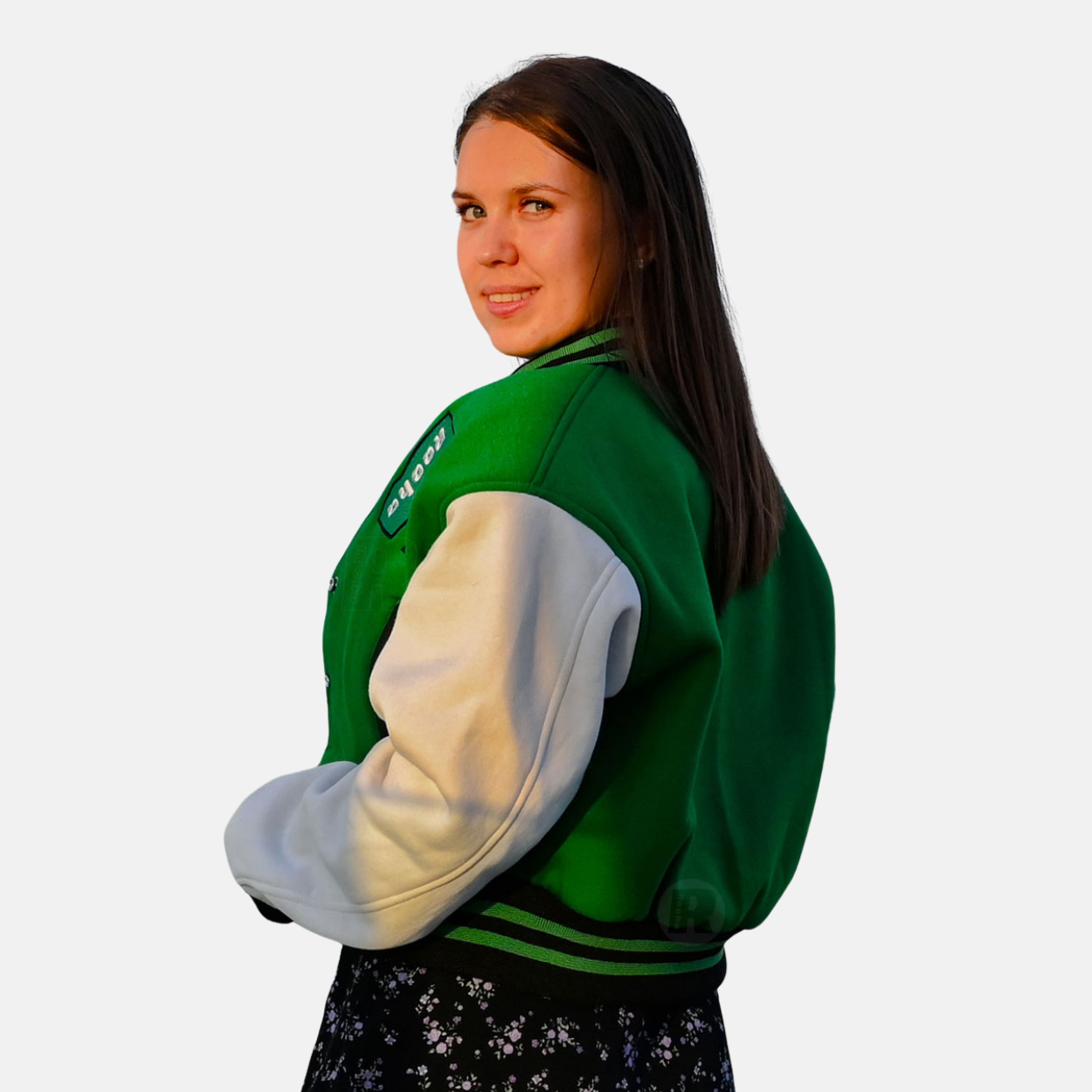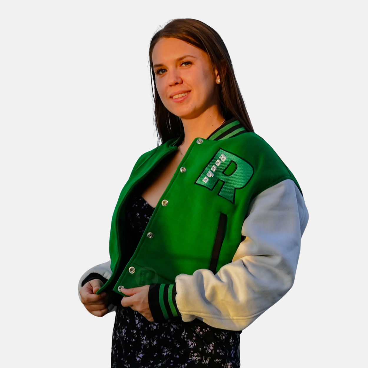 School Varsity Jackets Women are produced with a premium cotton fleece Green body and White sleeves. We used 100% acrylic ribbing on the collar, cuffs, and waistband. 7 polish-coated varsity snaps are used for front closure, two slash pockets, and one inside pocket as per sleeve materials.