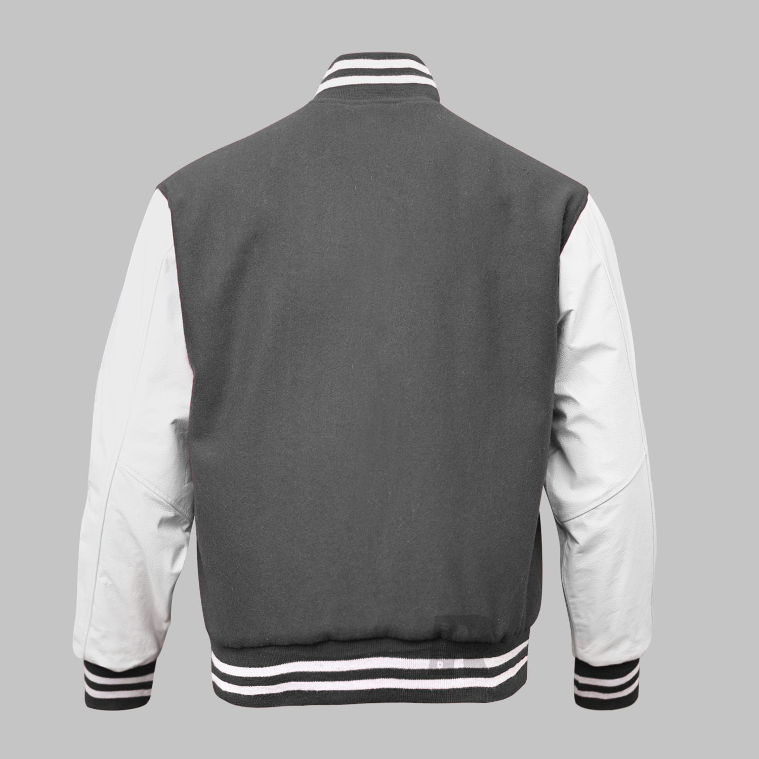 Senior Jacket Custom Made made of Superior quality of Wool 24-oz body in Grey and Genuine Cowhide Leather full Grain in White. This Custom Varsity Jacket with high quality 100% acrylic ribbing base color Grey and double stripe White on collar, waist and cuffs.