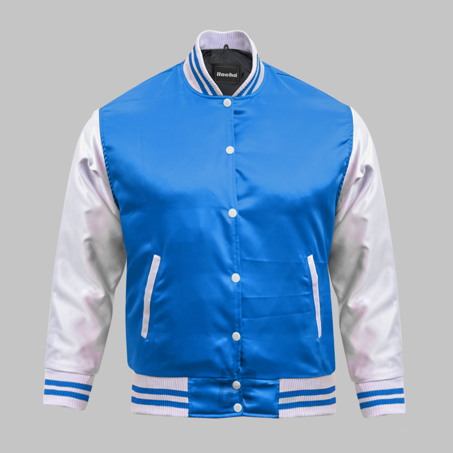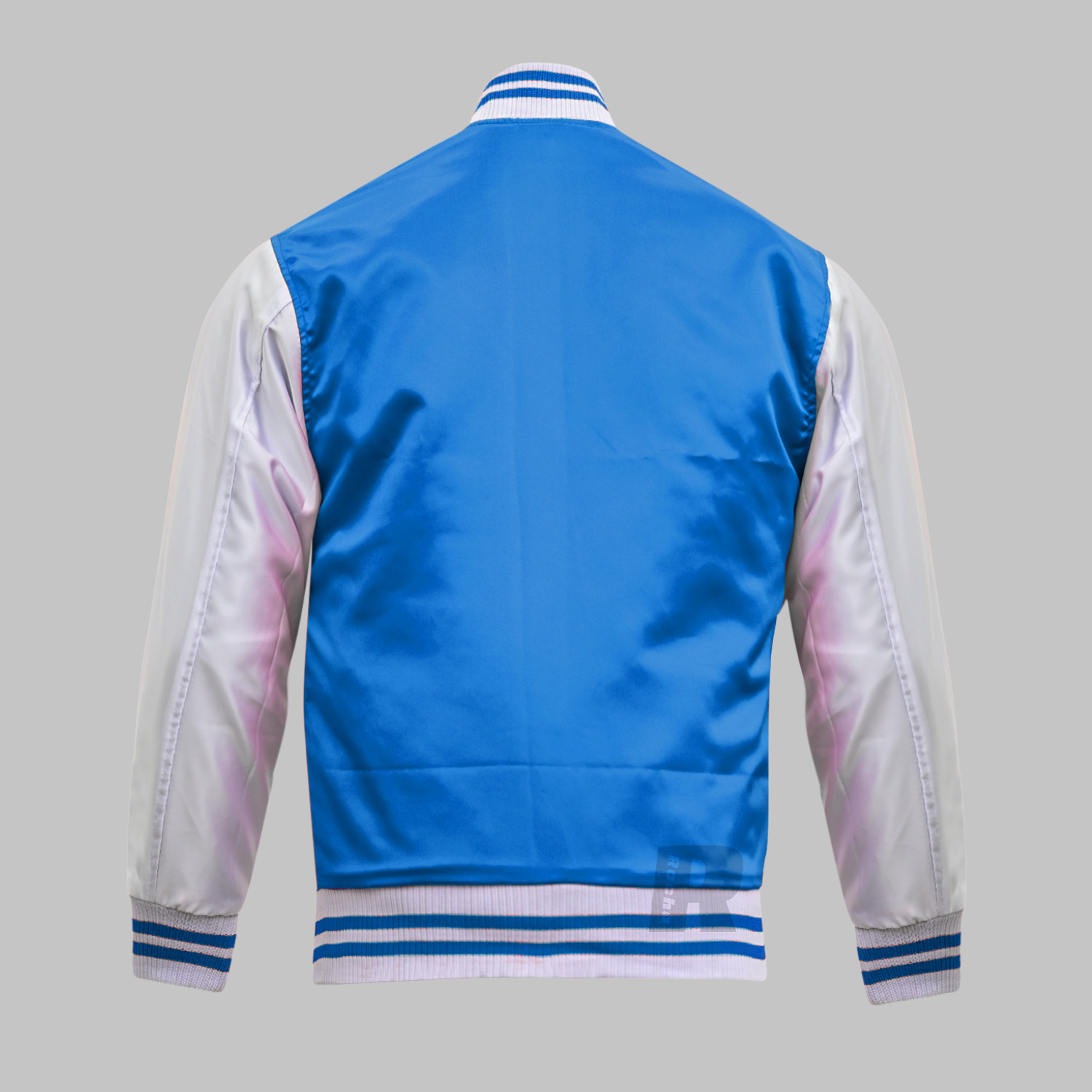 Senior jacket designer made of Superior quality of Polyester Satin body in Columbia Blue and Sleeves in White. This Custom Varsity Jacket with high quality 100% acrylic ribbing base color White and double stripe Columbia Blue on collar, waist and cuffs.
