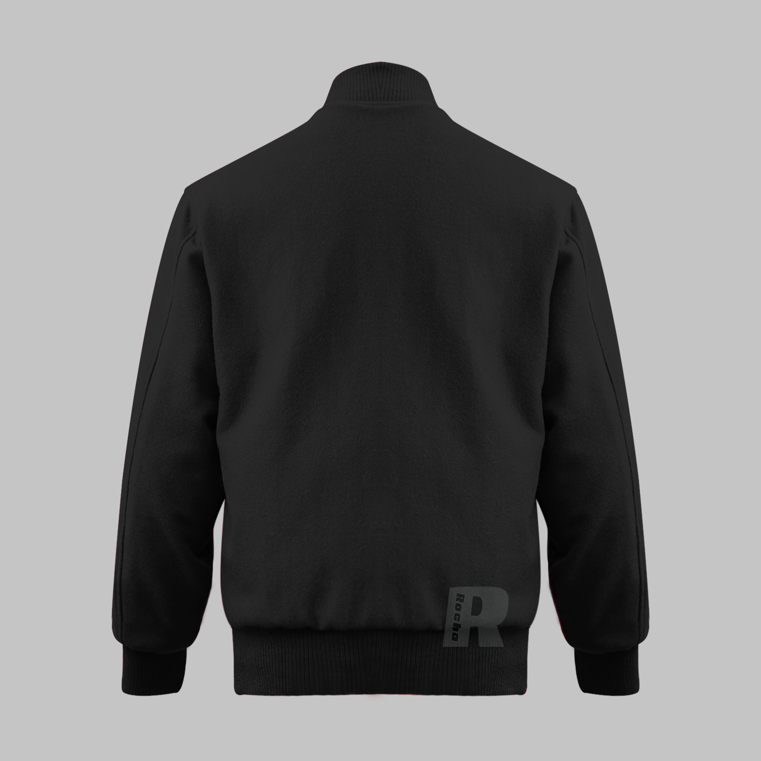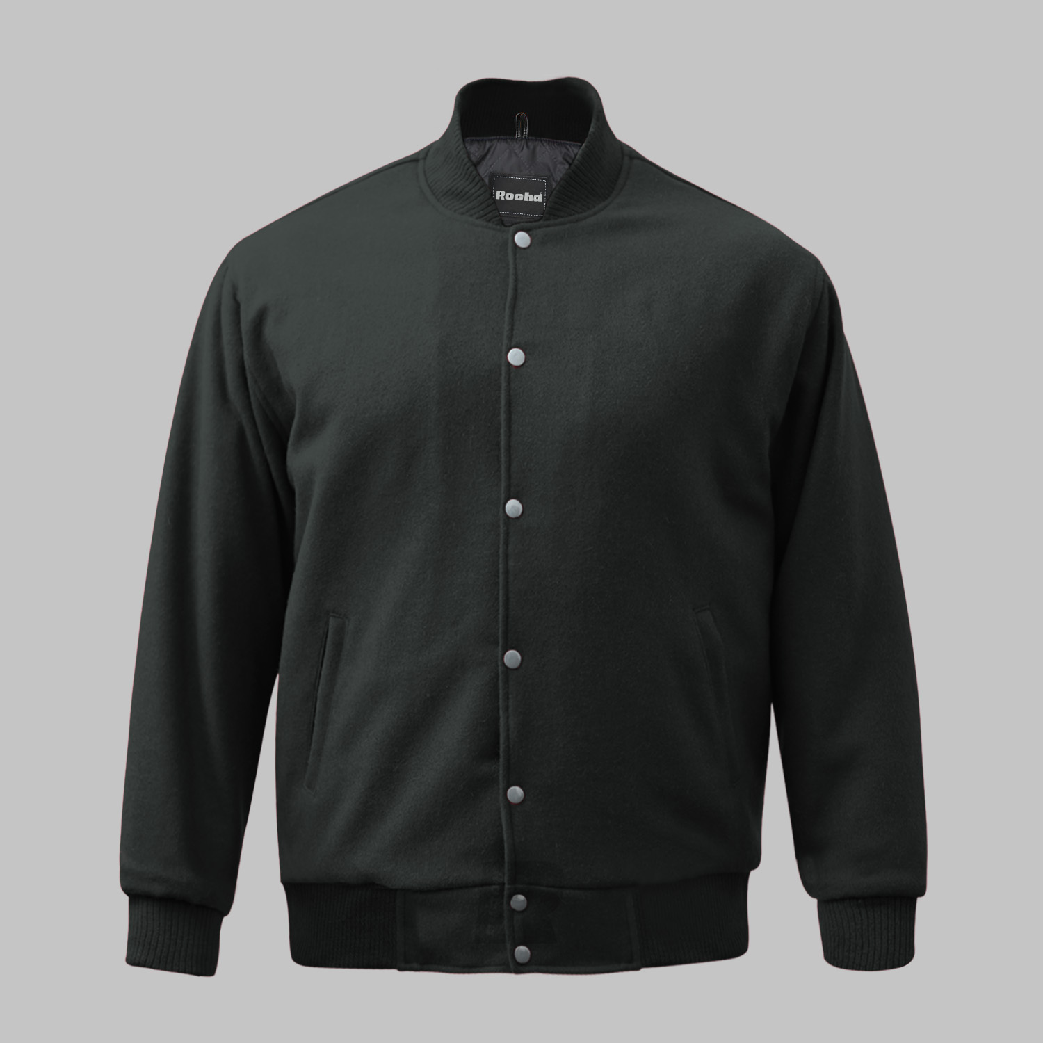 Senior jacket made of Superior quality of Wool 24-oz body and Sleeves in Black. This Custom Varsity Jacket with high quality 100% acrylic ribbing plain color Black on collar, waist and cuffs.