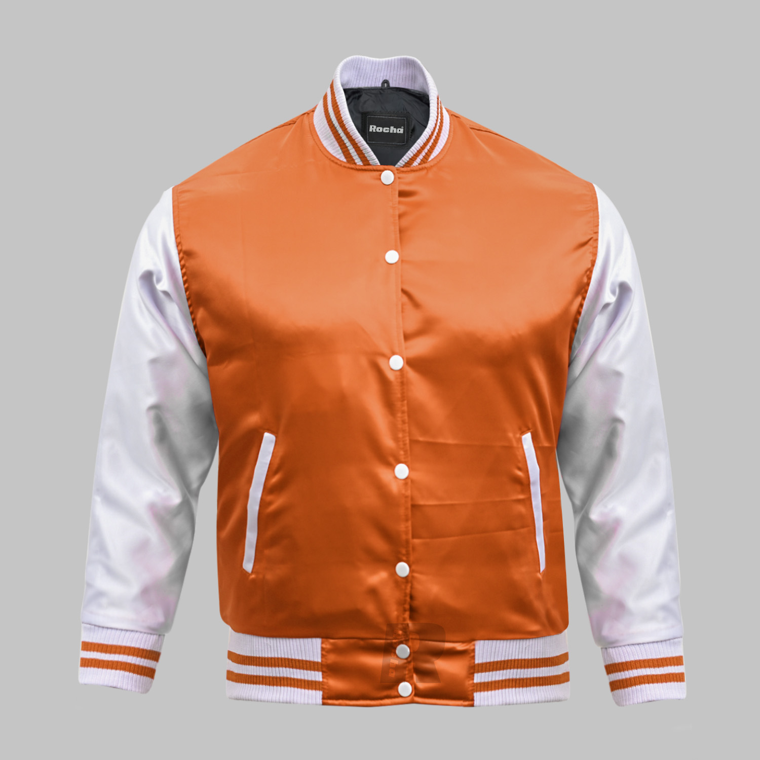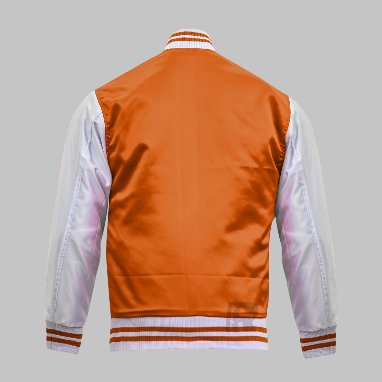 Senior jackets designer made of Superior quality of Polyester Satin body in Orange and Sleeves in White. This Custom Varsity Jacket with high quality 100% acrylic ribbing base color White and double stripe Orange on collar, waist and cuffs.