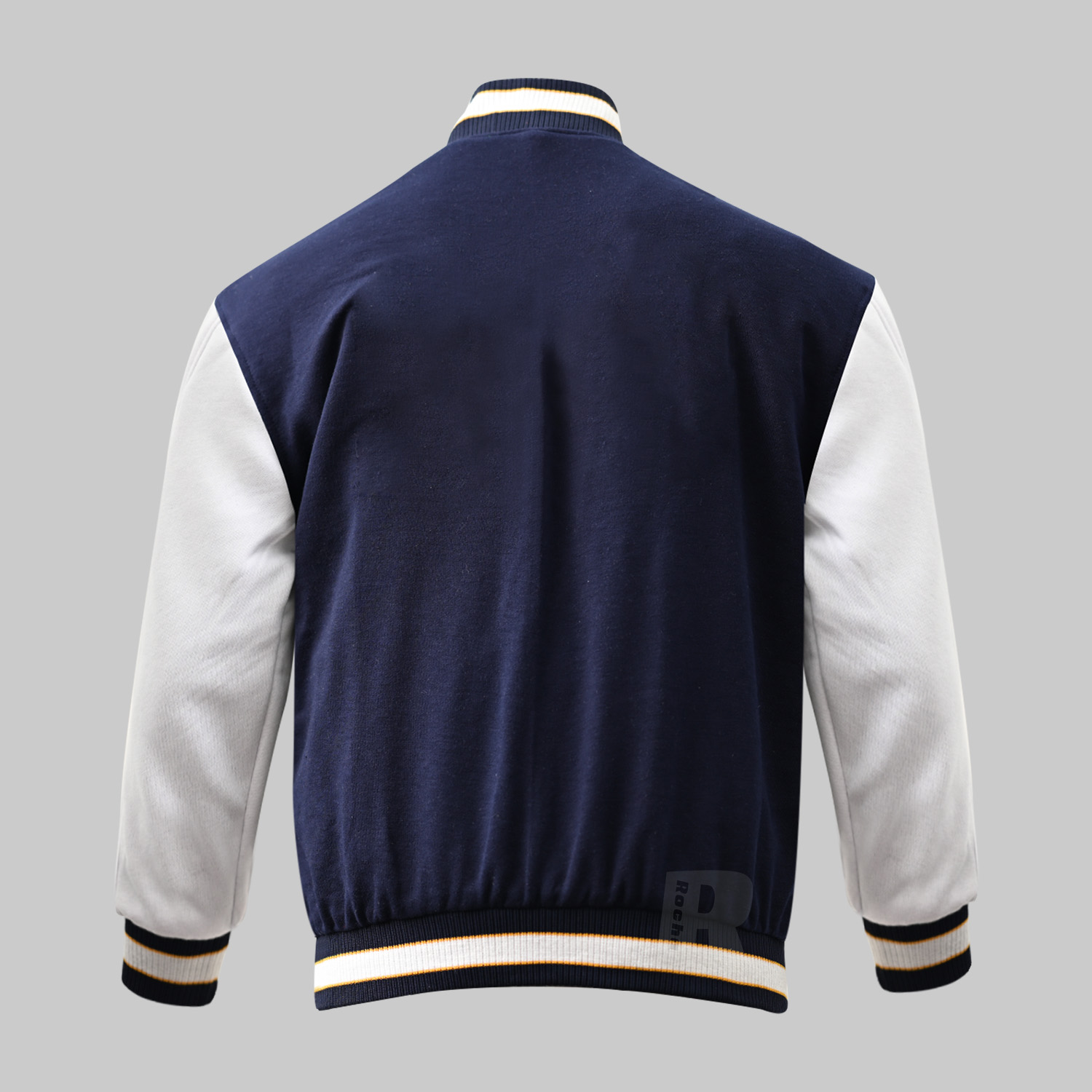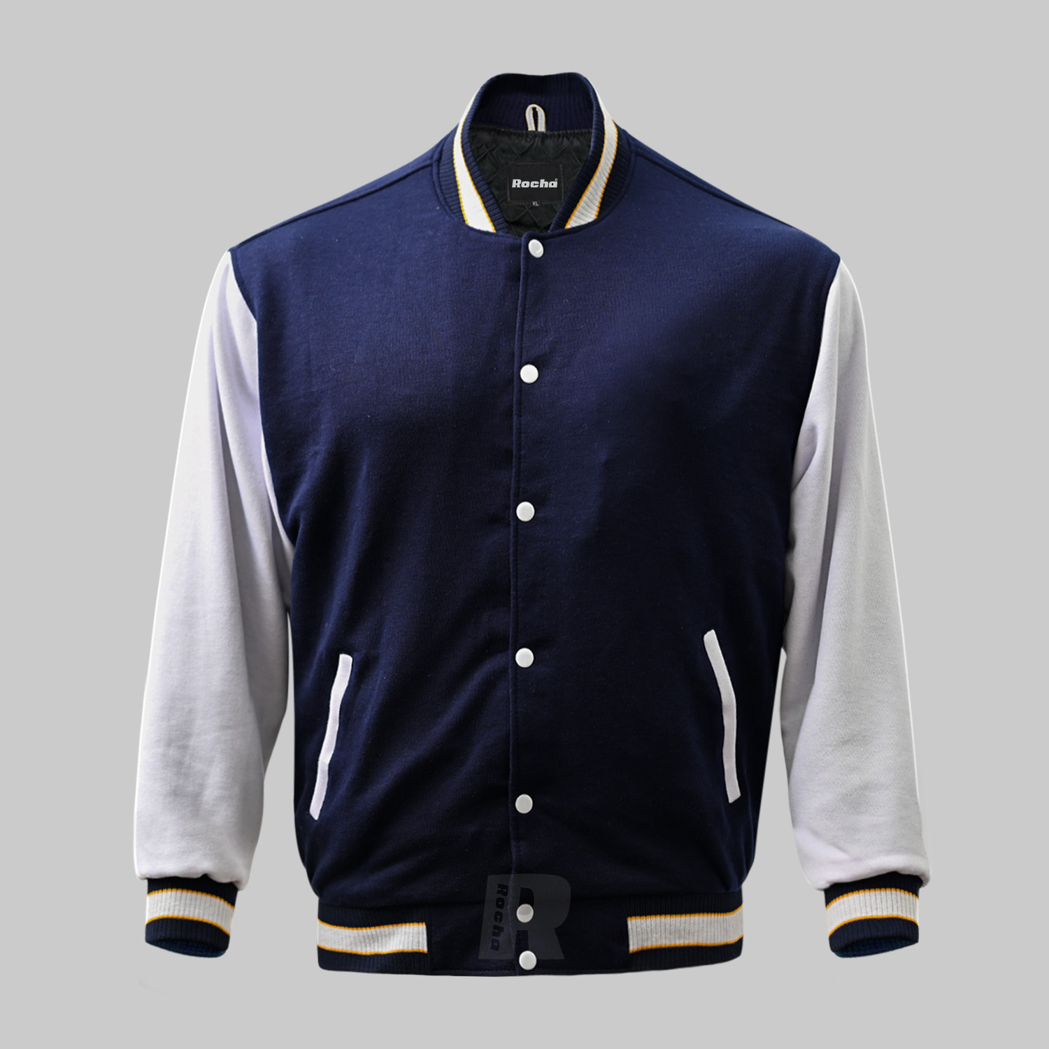 Varsity Jackets Los Angles made of Superior quality of Cotton Fleece 320 GSM body in Navy Blue and Sleeves in White. This Custom Varsity Jacket with high quality 100% acrylic ribbing base color Navy Blue and single stripe White on collar, waist and cuffs.