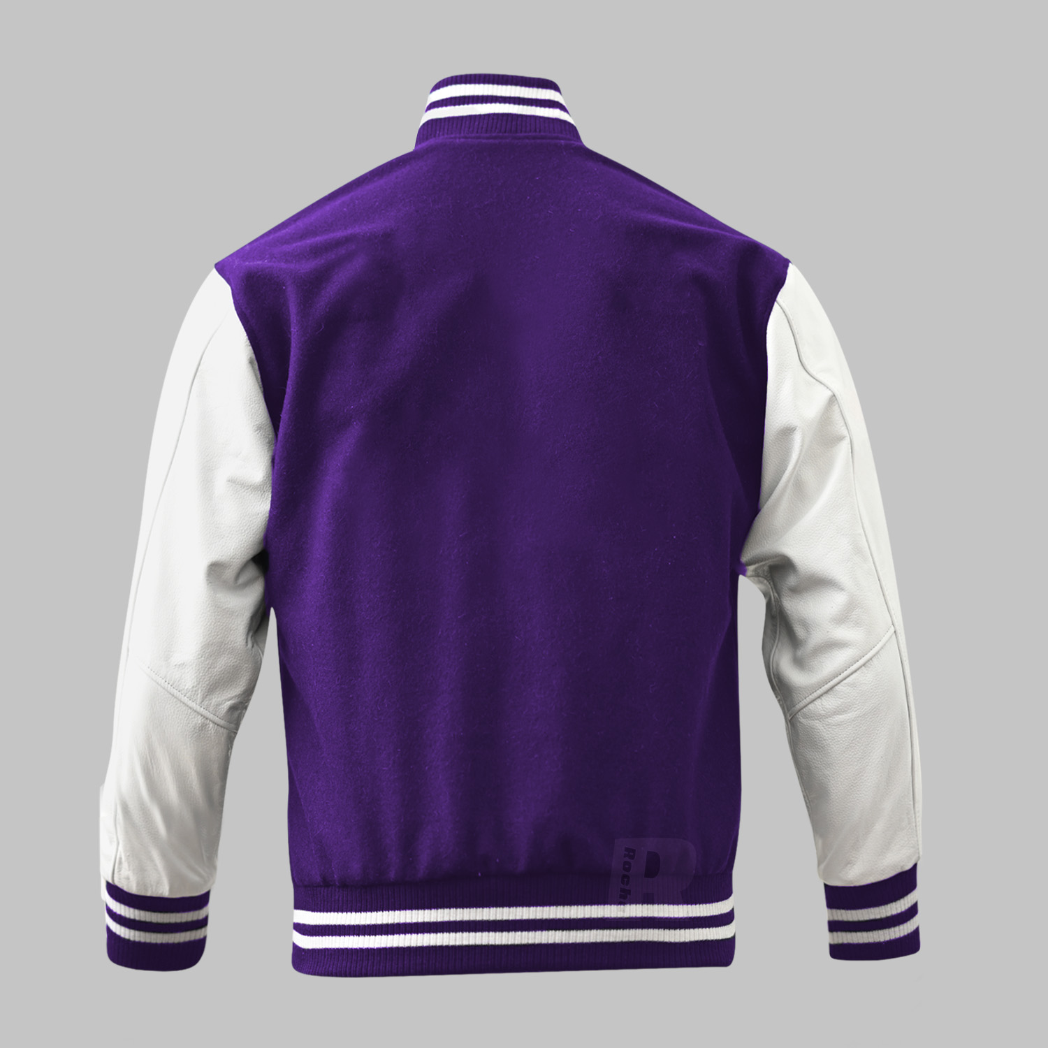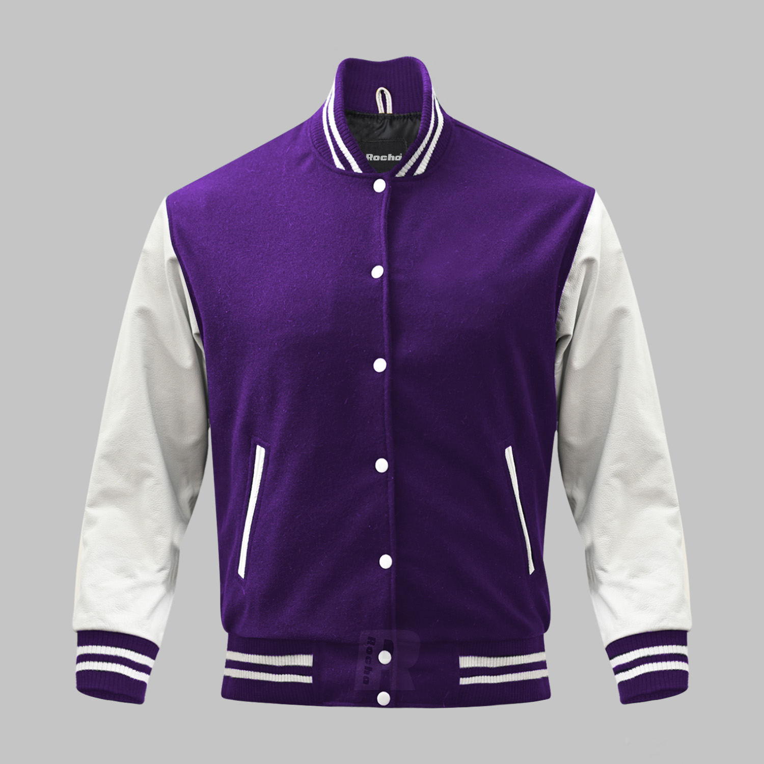 Varsity leather jacket customized made of Superior quality of Wool 24-oz body in Purple and Genuine Cowhide Leather full Grain in White. This Custom Varsity Jacket with high quality 100% acrylic ribbing base color Purple and double stripe White on collar, waist and cuffs.