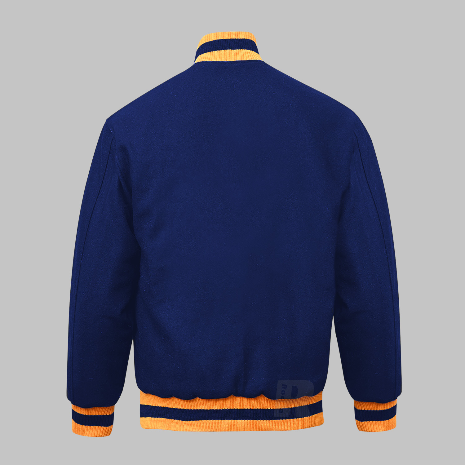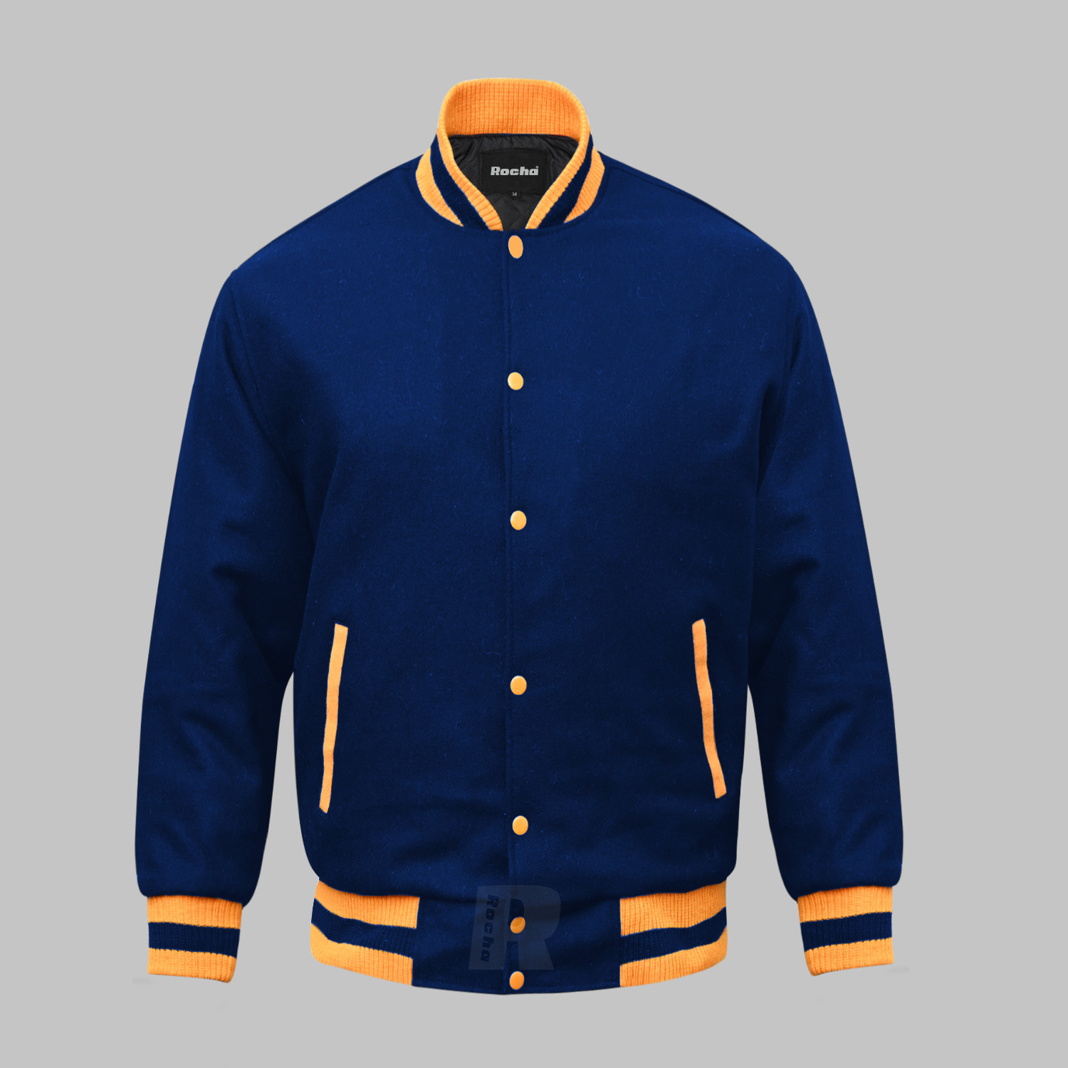 Vintage varsity jackets made of Superior quality of Wool 24-oz body and Sleeves in Navy blue. This Custom Varsity Jacket with high quality 100% acrylic ribbing base color Yellow and single stripe Navy Blue on collar, waist and cuffs.