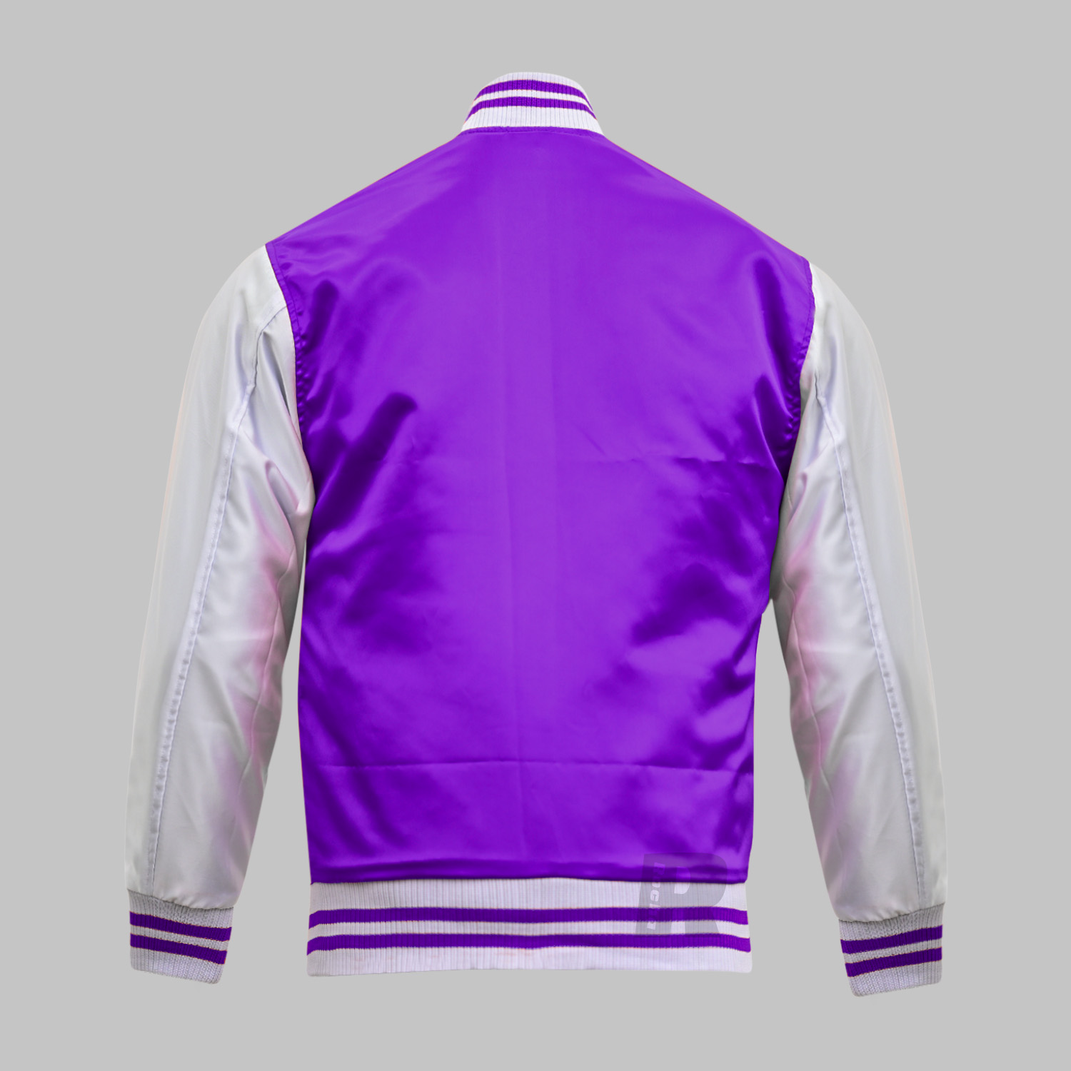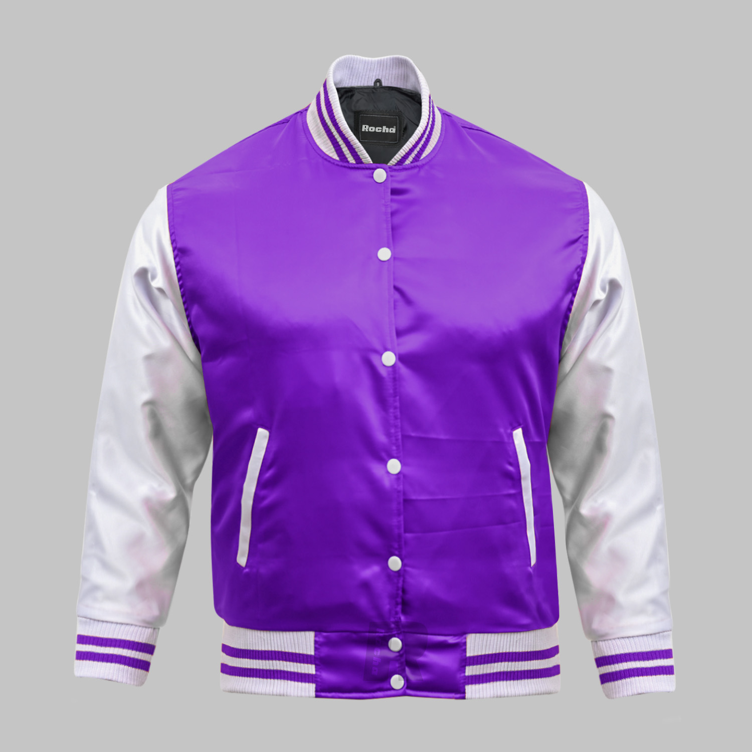 Where to get letterman jackets made of Superior quality of Polyester Satin body in Purple and Sleeves in White. This Custom Varsity Jacket with high quality 100% acrylic ribbing base color Purple and double stripe White on collar, waist and cuffs.