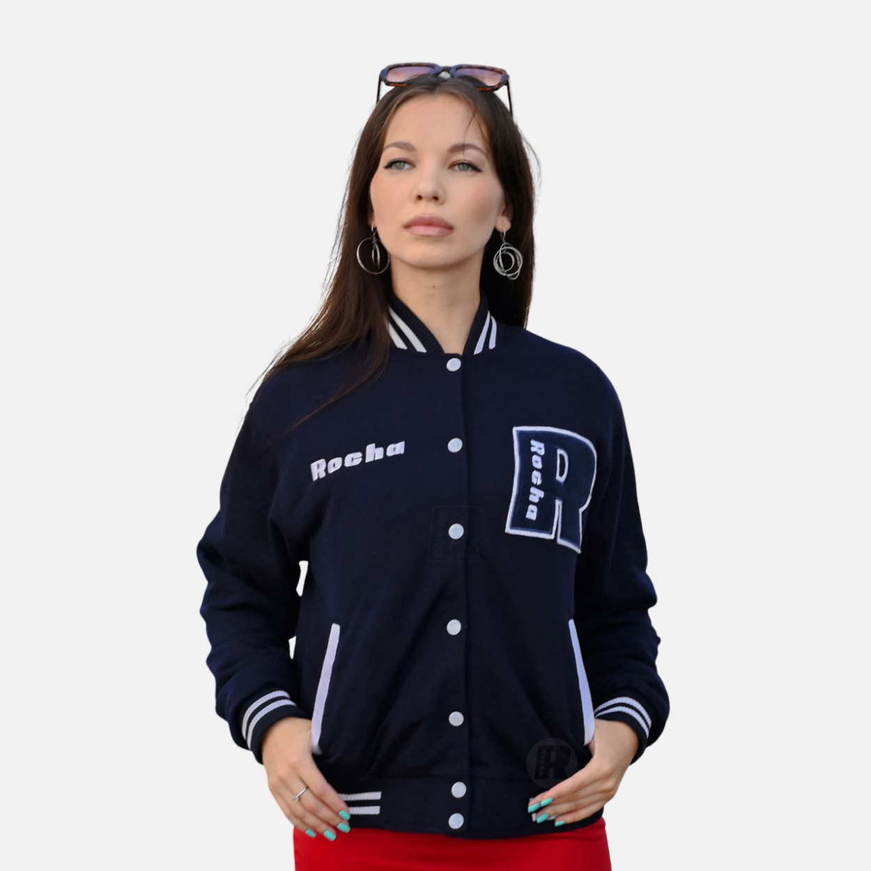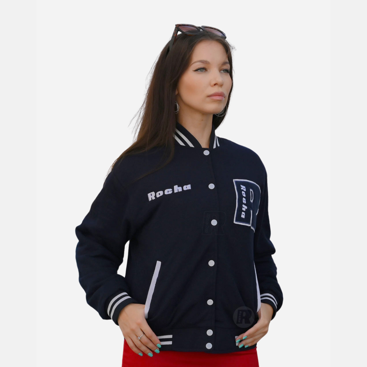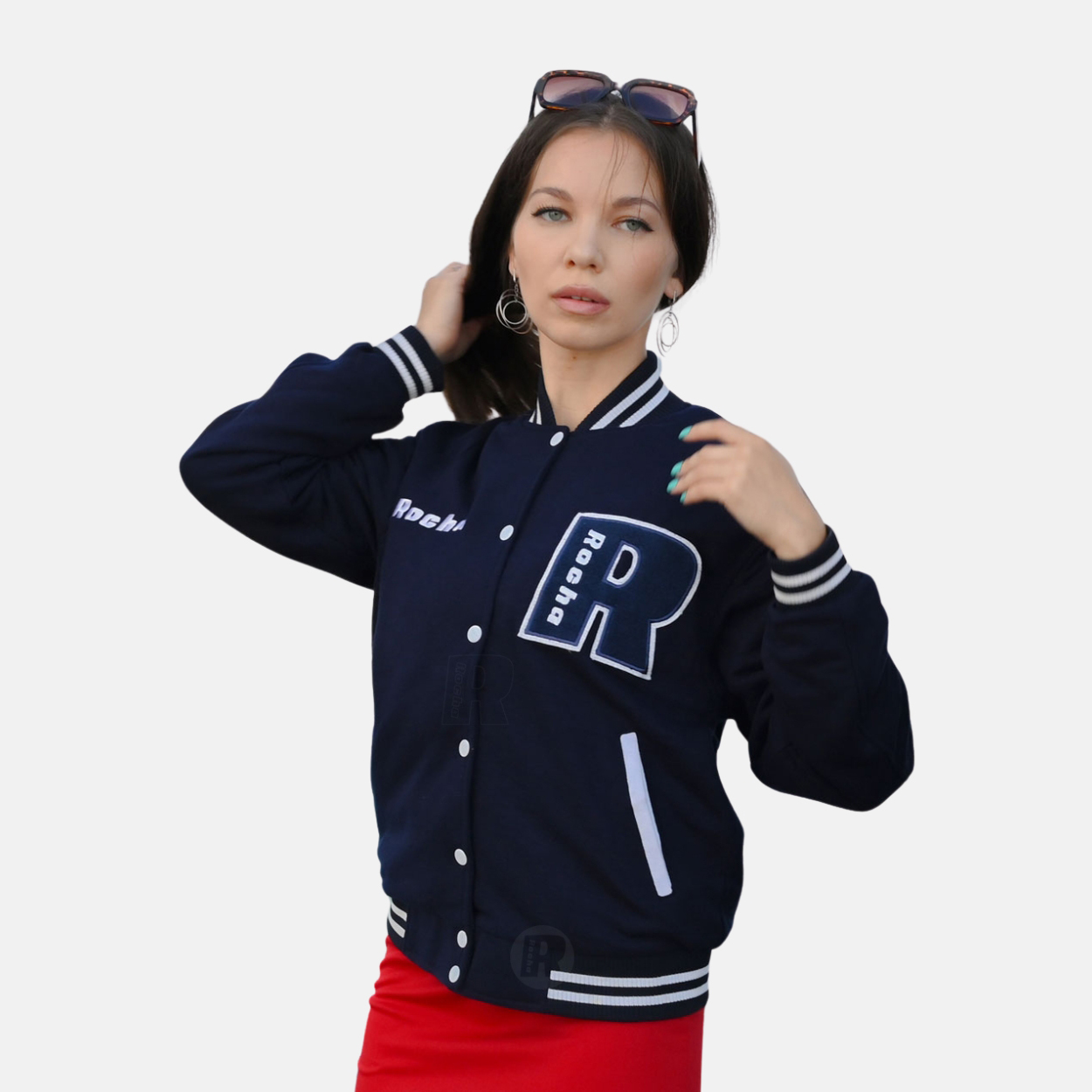 Women Letterman Jackets are produced with a premium cotton fleece Navy Blue body and sleeves. We used 100% acrylic ribbing on the collar, cuffs, and waistband. 7 polish-coated varsity snaps are used for front closure, two slash pockets, and one inside pocket as per sleeve materials.