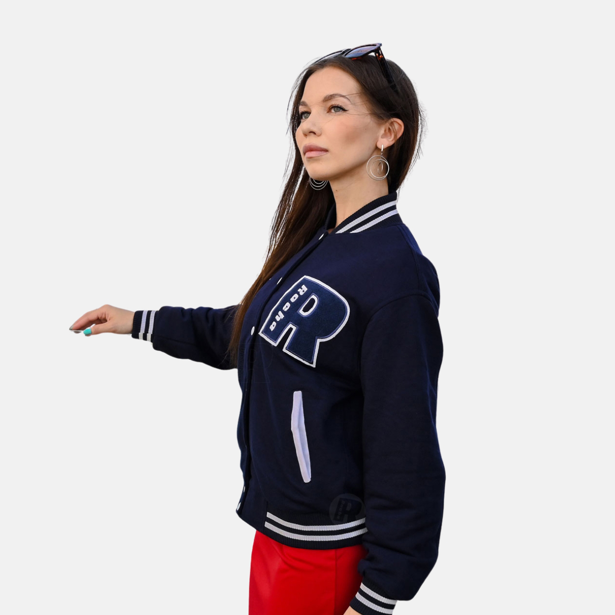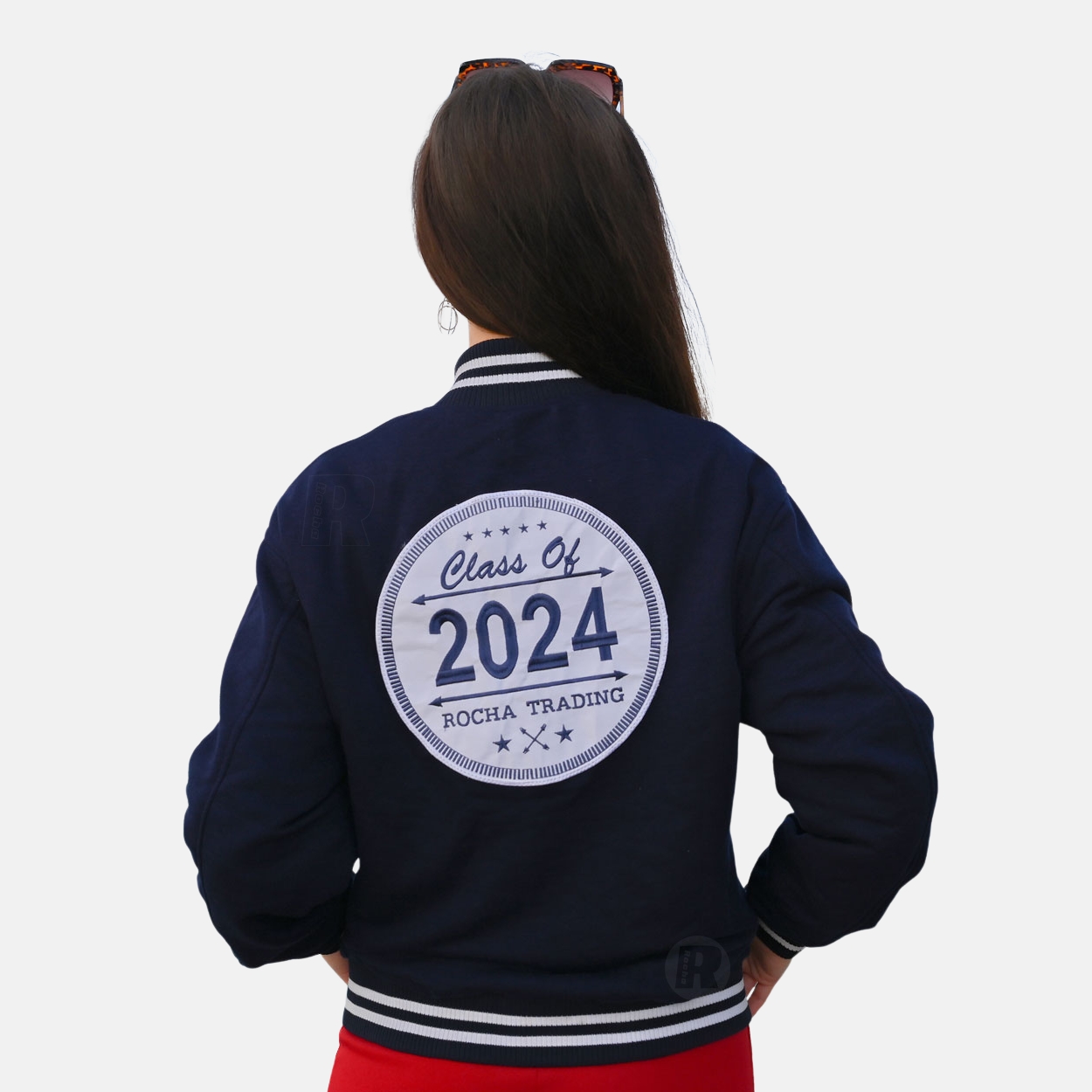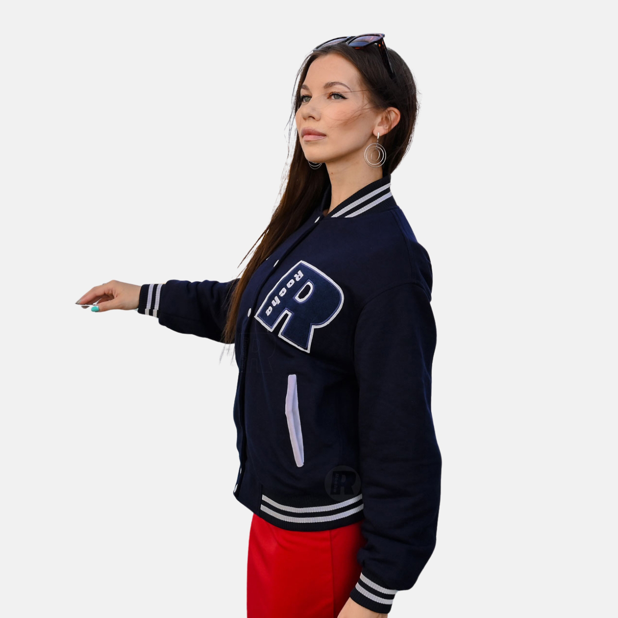 Women Letterman Jackets are produced with a premium cotton fleece Navy Blue body and sleeves. We used 100% acrylic ribbing on the collar, cuffs, and waistband. 7 polish-coated varsity snaps are used for front closure, two slash pockets, and one inside pocket as per sleeve materials.